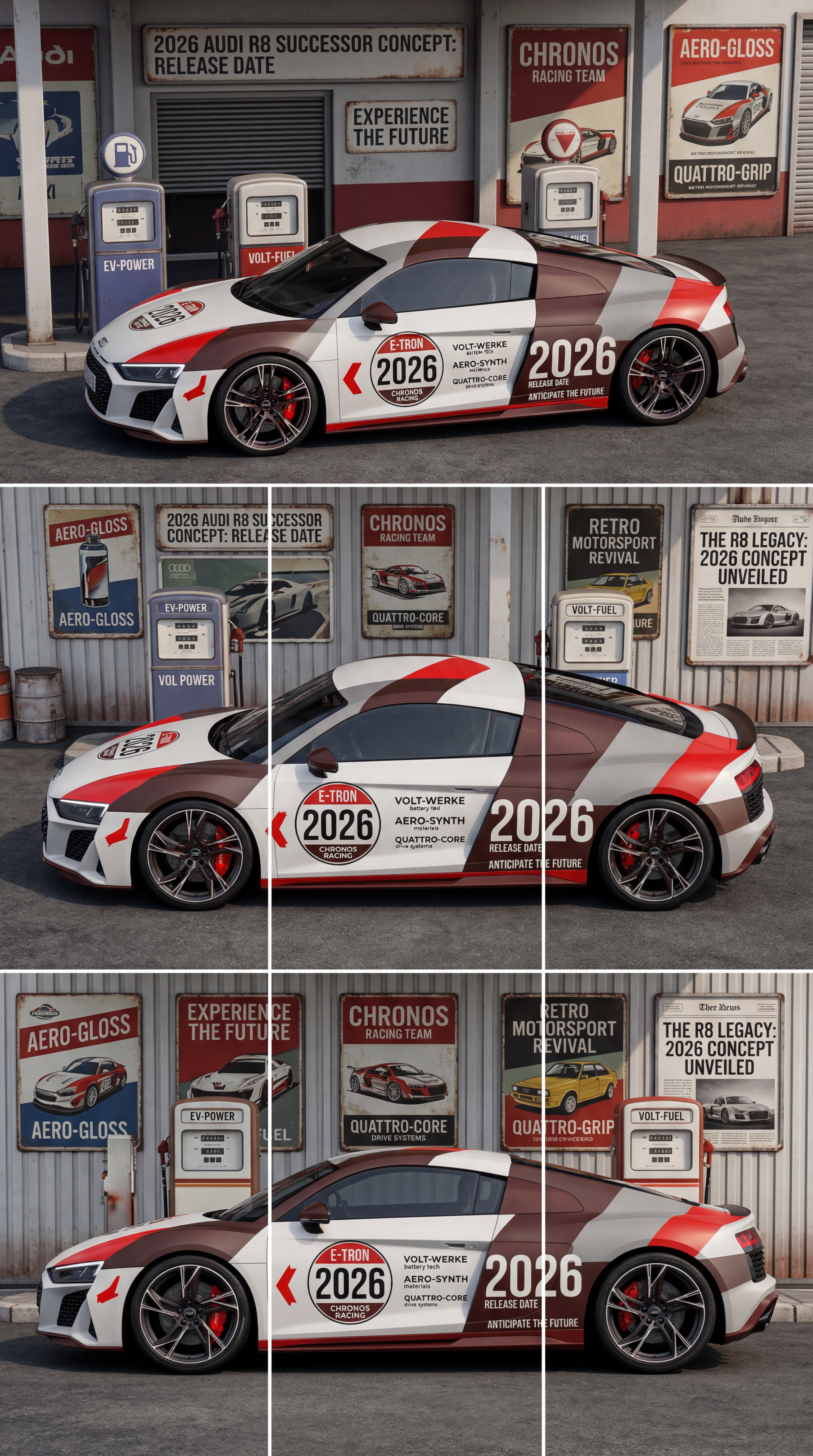 Exterior-only SEO concept render of the Audi R8 Successor Concept supercar. Search intent target: "2026 audi r8 successor concept release date". Direction: retro motorsport revival with modern materials and period-correct composition. Wrap/livery concept: minimal endurance-racing template with high-contrast number plates and brake-cooling arrows. Overlay plan: fake sponsor overlays only: invented team names, fictional partner tags, custom race numbers. Scene: at a small-town fuel station styled as a retro poster set. Camera: elevated drone-like frame emphasizing livery readability. Lighting: studio-grade key/fill setup adapted to outdoor realism. Render style: photoreal EV concept rendering with technical surface detail and precise lighting. Creative hook: social-carousel friendly crop logic and high color separation. Keep it relevant to the search query and avoid duplicating prior visual directions for similar models. If web grounding is available, incorporate up-to-date public facts that support the keyword context and keep claims realistic. Use fictional/parody overlay labels only (no exact trademark logos). No interior views, no cabin, no cockpit, no dashboard, no seats, no people, no explicit smoking act, no watermarks.