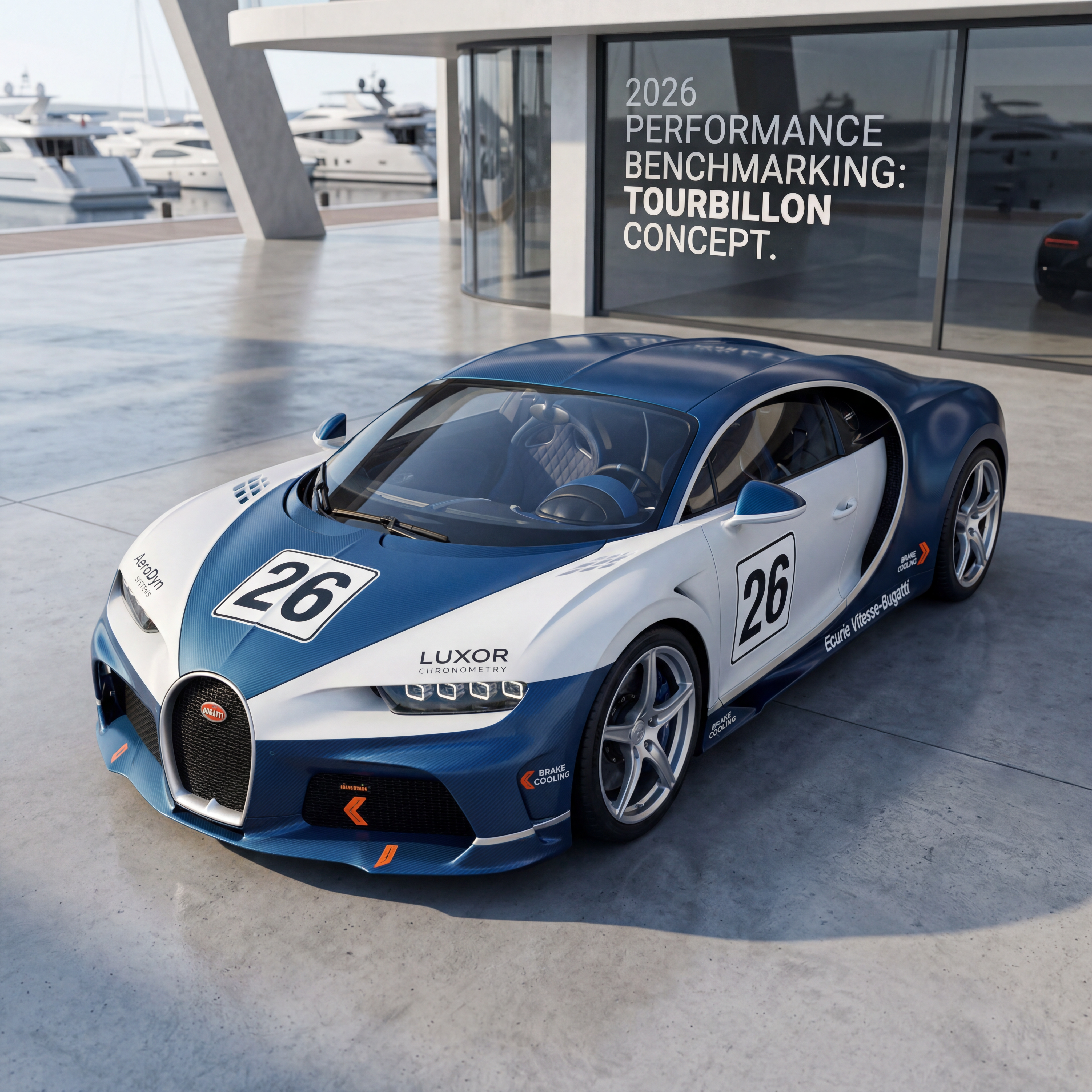 Exterior-only SEO concept render of the Bugatti Tourbillon Concept hypercar. Search intent target: "2026 bugatti tourbillon concept top speed". Direction: showroom launch visual with high CTR composition for image search. Wrap/livery concept: minimal endurance-racing template with high-contrast number plates and brake-cooling arrows. Overlay plan: fake sponsor overlays only: invented team names, fictional partner tags, custom race numbers. Scene: outside a luxury marina with polished concrete and glass facades. Camera: elevated drone-like frame emphasizing livery readability. Lighting: studio-grade key/fill setup adapted to outdoor realism. Render style: photorealistic automotive marketing render with premium detail and realistic materials. Creative hook: social-carousel friendly crop logic and high color separation. Keep it relevant to the search query and avoid duplicating prior visual directions for similar models. If web grounding is available, incorporate up-to-date public facts that support the keyword context and keep claims realistic. Use fictional/parody overlay labels only (no exact trademark logos). No interior views, no cabin, no cockpit, no dashboard, no seats, no people, no explicit smoking act, no watermarks.