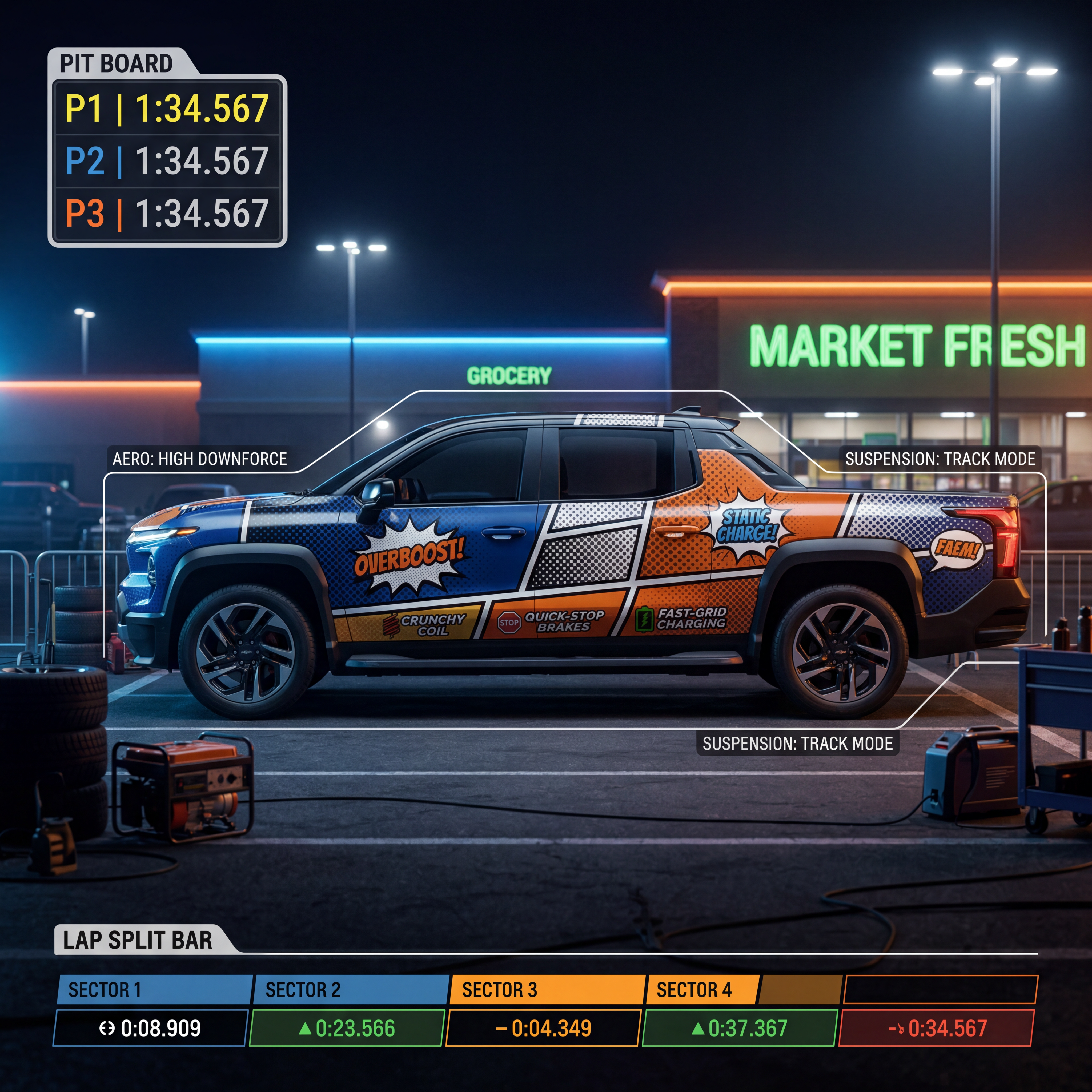 Exterior-only SEO concept render of the Chevrolet Silverado Concept pickup truck. Search intent target: "2026 chevrolet silverado concept redesign". Direction: motorsport x streetwear crossover with bold visual hierarchy for thumbnails. Wrap/livery concept: comic-book halftone impact panels with parody sponsor badges and speech-bubble icons. Overlay plan: motorsport telemetry overlays: faux pit board icons, lap split bars, and setup labels. Scene: in a suburban supermarket parking lot staged like a race paddock. Camera: tight side profile with long lens compression. Lighting: nighttime neon contrast with controlled bloom. Render style: photoreal EV concept rendering with technical surface detail and precise lighting. Creative hook: thumbnail-first composition with immediate visual hierarchy. Keep it relevant to the search query and avoid duplicating prior visual directions for similar models. If web grounding is available, incorporate up-to-date public facts that support the keyword context and keep claims realistic. Use fictional/parody overlay labels only (no exact trademark logos). No interior views, no cabin, no cockpit, no dashboard, no seats, no people, no explicit smoking act, no watermarks.