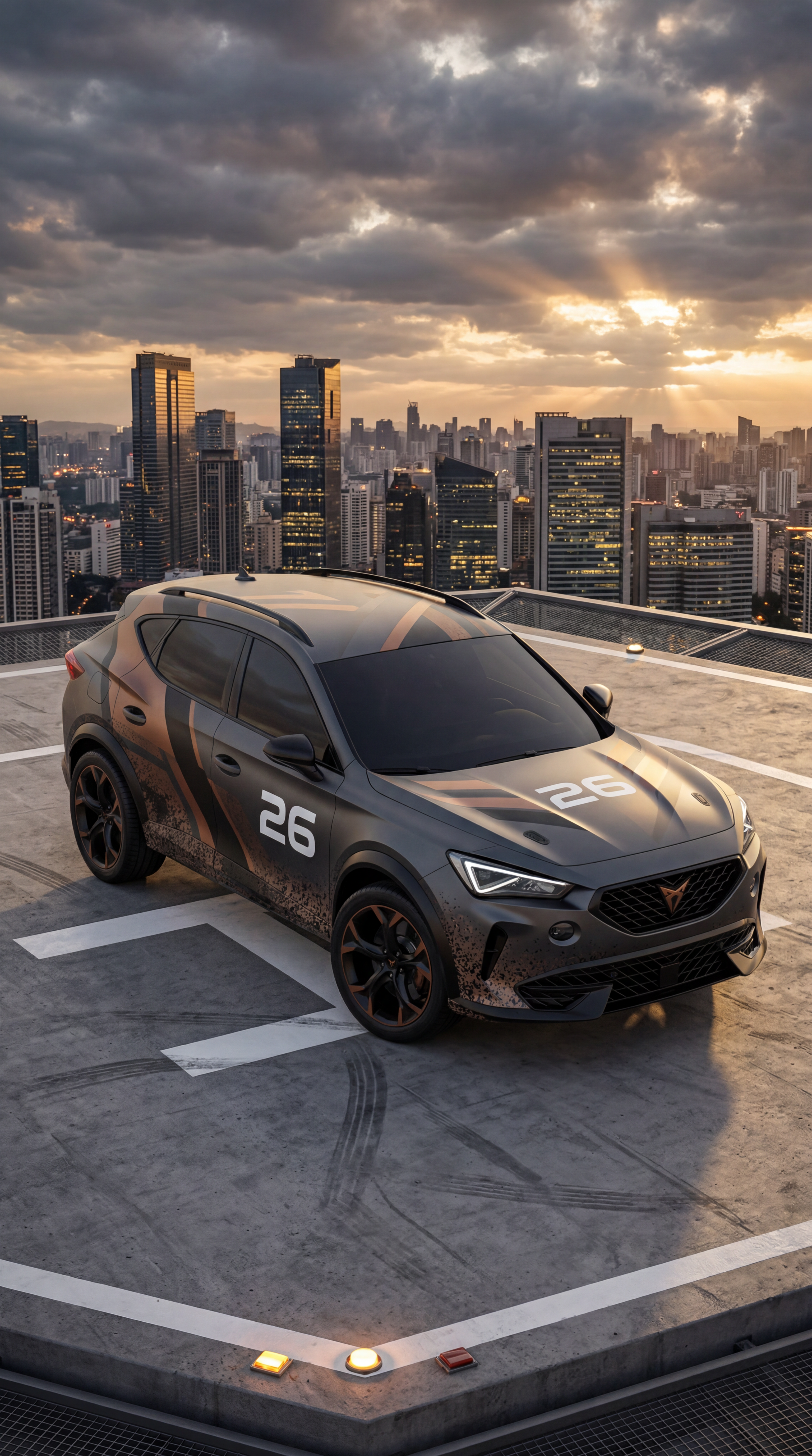 Exterior-only concept render of the 2026 CUPRA Formentor VZ Concept SUV, captured from a high drone angle emphasizing body geometry, on a rooftop helipad overlooking a dense city skyline at sunset. Render style: photorealistic automotive marketing render with premium detail and realistic materials. Wrap direction: rally-inspired gravel livery with race numbers and dynamic stripes. storm-break lighting with dramatic cloud texture and rim light. Premium automotive marketing image for PSEO intent around "2026 cupra formentor vz concept price" and related car model searches. No interior views, no cabin, no cockpit, no dashboard, no seats, no people, no text overlays, no logos, no watermarks.