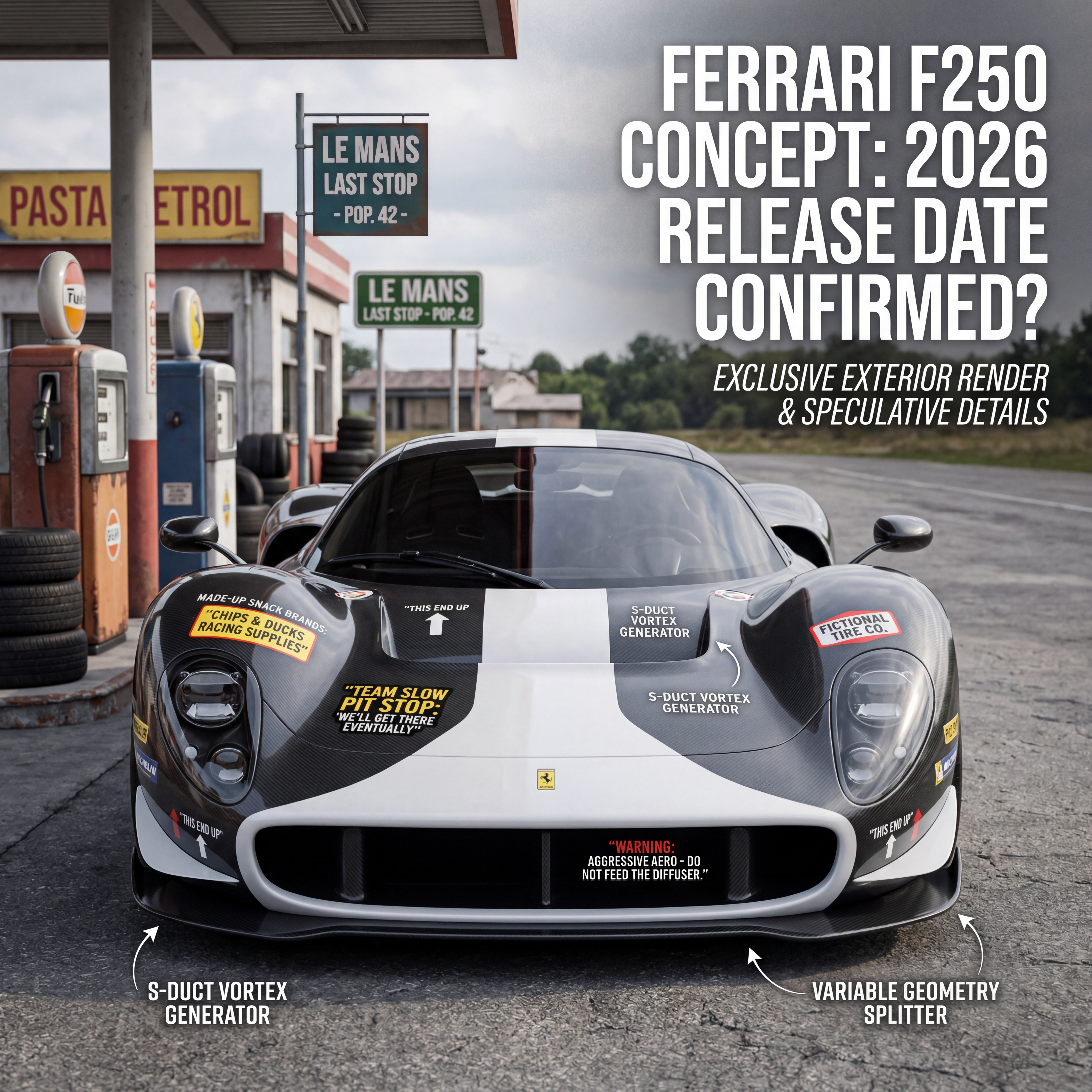 Exterior-only SEO concept render of the Ferrari F250 Concept hypercar. Search intent target: "2026 ferrari f250 concept release date". Direction: retro motorsport revival with modern materials and period-correct composition. Wrap/livery concept: heritage endurance stripes with contemporary geometry and polished aero callouts. Overlay plan: humor-first overlays: made-up snack brands, joke pit crew logos, and playful warning stickers. Scene: at a small-town fuel station styled as a retro poster set. Camera: head-on symmetry with aggressive stance emphasis. Lighting: overcast softbox light that reveals body surfacing. Render style: photorealistic automotive marketing render with premium detail and realistic materials. Creative hook: editorial magazine cover feel with clean negative space. Keep it relevant to the search query and avoid duplicating prior visual directions for similar models. If web grounding is available, incorporate up-to-date public facts that support the keyword context and keep claims realistic. Use fictional/parody overlay labels only (no exact trademark logos). No interior views, no cabin, no cockpit, no dashboard, no seats, no people, no explicit smoking act, no watermarks.