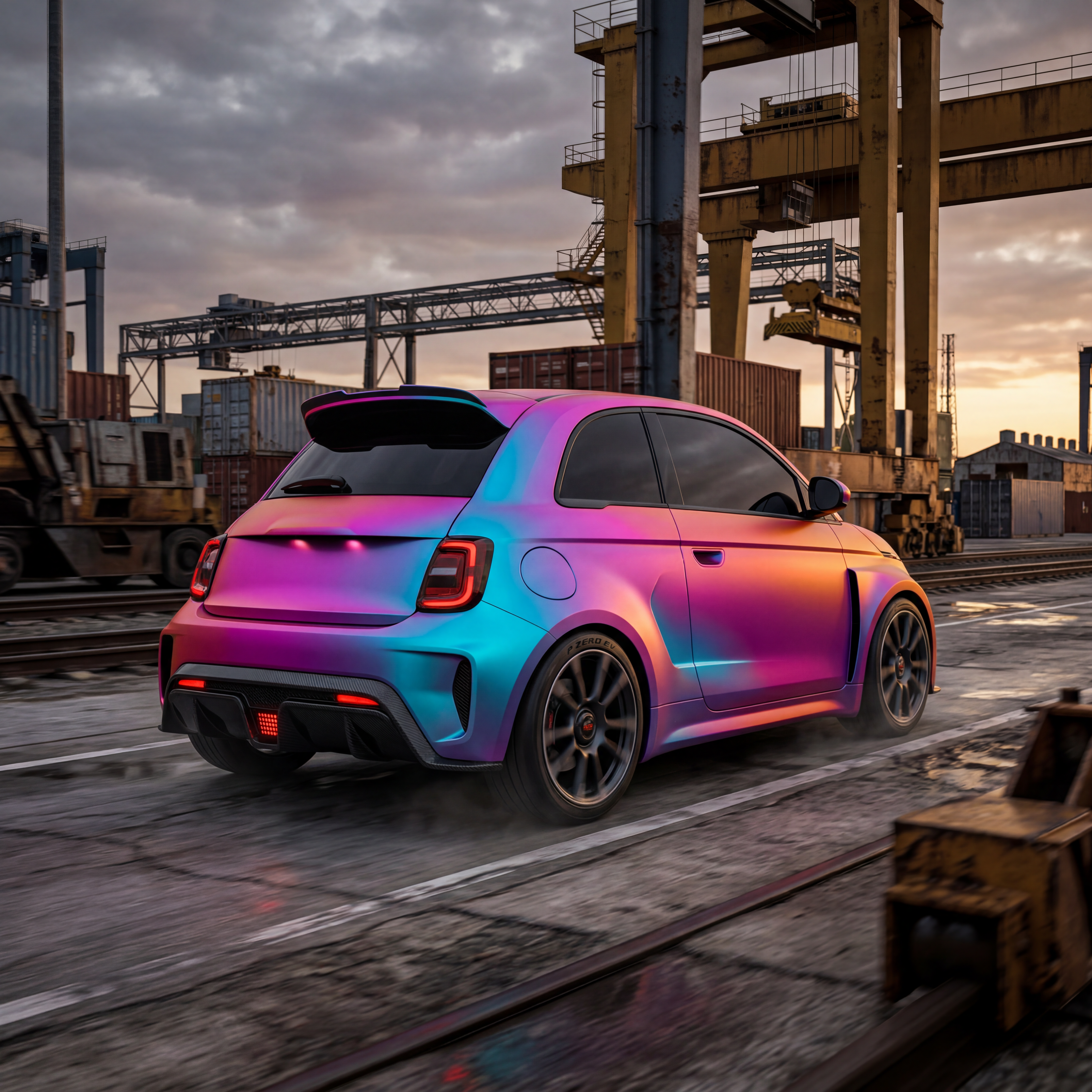 Exterior-only concept render of the 2026 Fiat 500 Abarth EV Concept electric vehicle, captured from a rear three-quarter rolling perspective, in an industrial dockyard with cranes, steel textures, and hard shadows. Render style: photorealistic automotive marketing render with premium detail and realistic materials. Wrap direction: sunset synthwave wrap blending magenta, orange, and electric cyan. overcast softbox sky lighting that reveals panel surfacing. Premium automotive marketing image for PSEO intent around "2026 fiat 500 abarth ev concept hp" and related car model searches. No interior views, no cabin, no cockpit, no dashboard, no seats, no people, no text overlays, no logos, no watermarks.