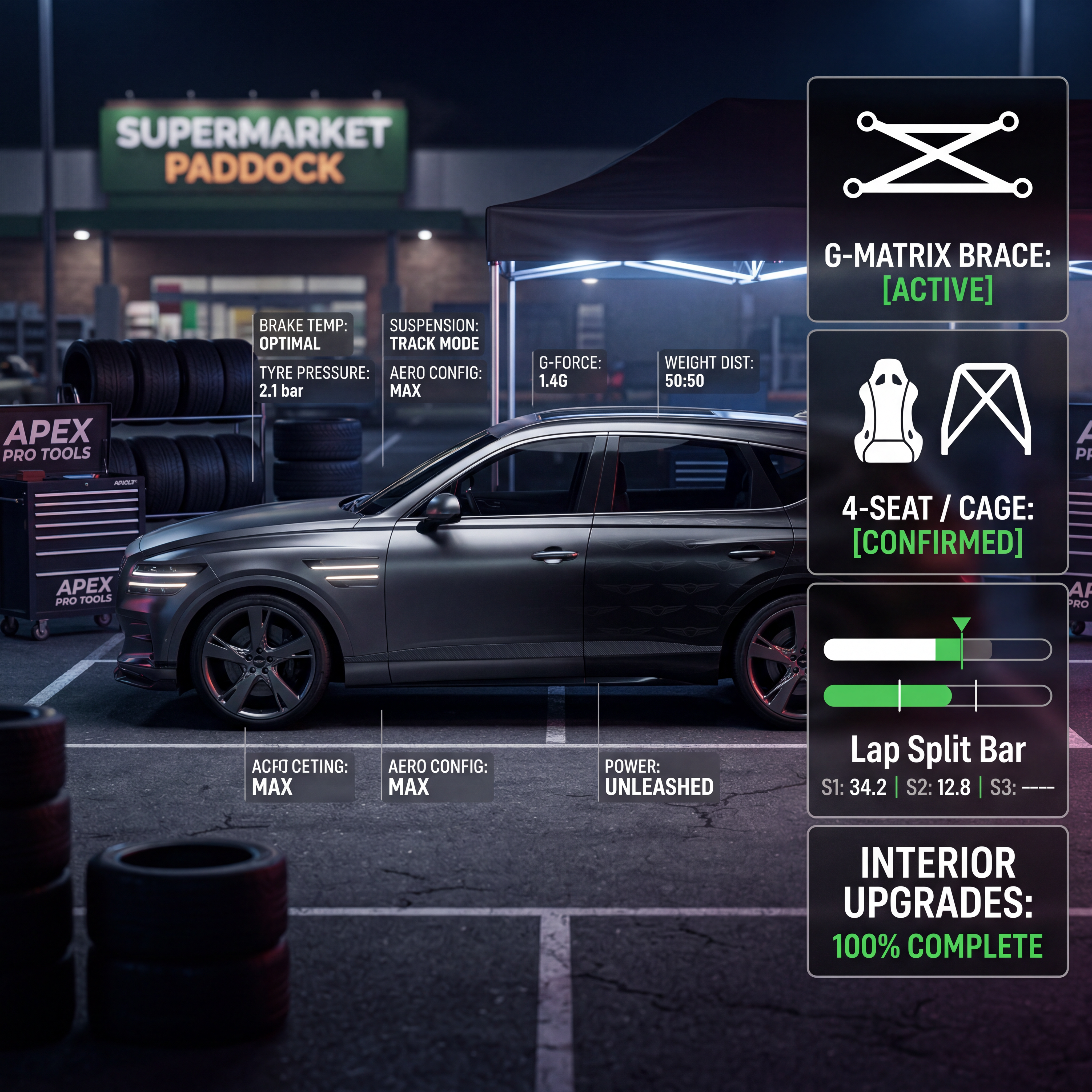 Exterior-only SEO concept render of the Genesis GV80 Concept SUV. Search intent target: "2026 genesis gv80 concept interior upgrades". Direction: motorsport x streetwear crossover with bold visual hierarchy for thumbnails. Wrap/livery concept: luxury monochrome wrap with satin metallic gradients and subtle pinstriped crest motifs. Overlay plan: motorsport telemetry overlays: faux pit board icons, lap split bars, and setup labels. Scene: in a suburban supermarket parking lot staged like a race paddock. Camera: tight side profile with long lens compression. Lighting: nighttime neon contrast with controlled bloom. Render style: photorealistic automotive marketing render with premium detail and realistic materials. Creative hook: thumbnail-first composition with immediate visual hierarchy. Keep it relevant to the search query and avoid duplicating prior visual directions for similar models. If web grounding is available, incorporate up-to-date public facts that support the keyword context and keep claims realistic. Use fictional/parody overlay labels only (no exact trademark logos). No interior views, no cabin, no cockpit, no dashboard, no seats, no people, no explicit smoking act, no watermarks.
