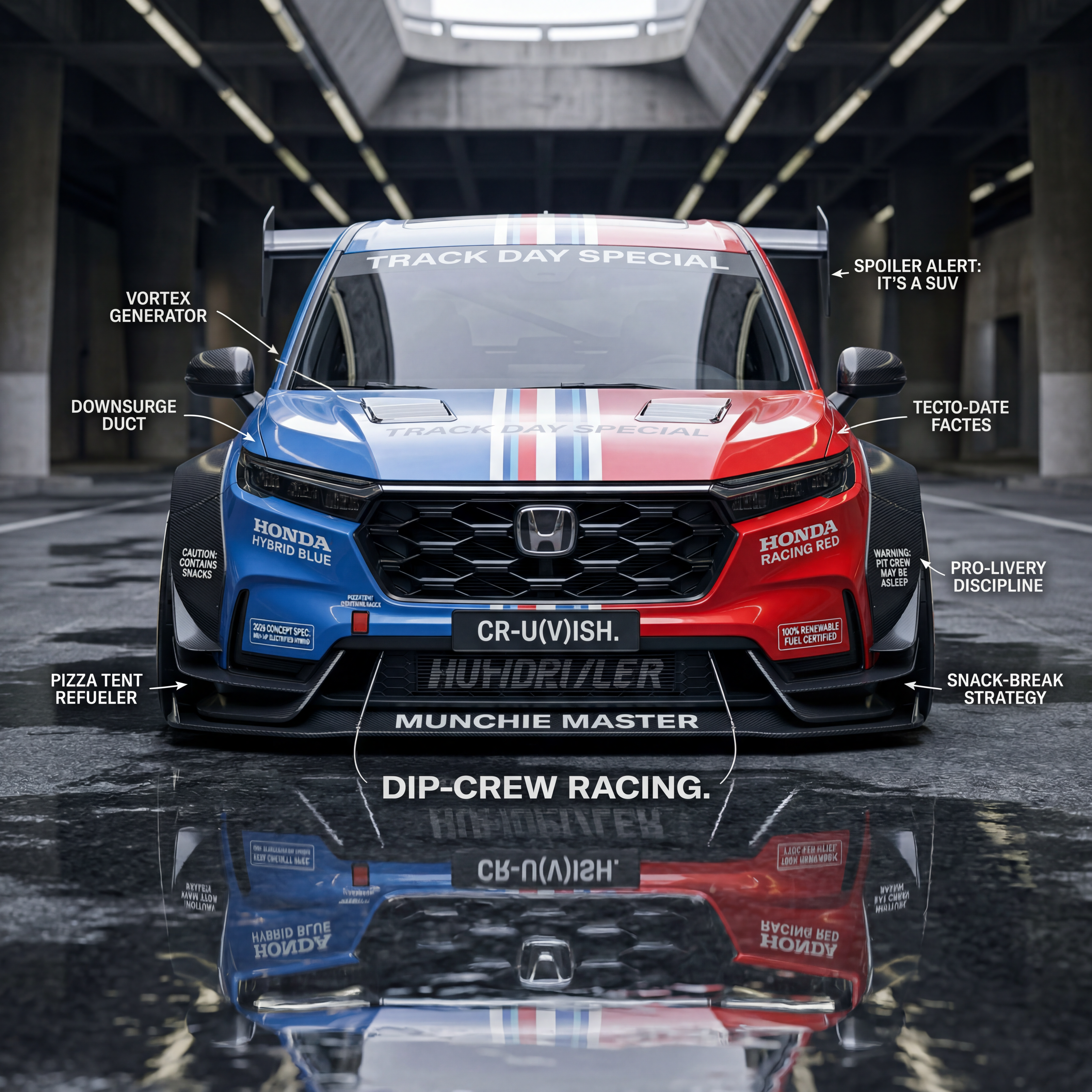 Exterior-only SEO concept render of the Honda CR-V Concept SUV. Search intent target: "2026 honda cr-v concept interior". Direction: track-day special theme for an ordinary commuter car with pro-livery discipline. Wrap/livery concept: heritage endurance stripes with contemporary geometry and polished aero callouts. Overlay plan: humor-first overlays: made-up snack brands, joke pit crew logos, and playful warning stickers. Scene: on a wet downtown underpass with reflection-heavy asphalt. Camera: head-on symmetry with aggressive stance emphasis. Lighting: overcast softbox light that reveals body surfacing. Render style: photorealistic automotive marketing render with premium detail and realistic materials. Creative hook: editorial magazine cover feel with clean negative space. Keep it relevant to the search query and avoid duplicating prior visual directions for similar models. If web grounding is available, incorporate up-to-date public facts that support the keyword context and keep claims realistic. Use fictional/parody overlay labels only (no exact trademark logos). No interior views, no cabin, no cockpit, no dashboard, no seats, no people, no explicit smoking act, no watermarks.