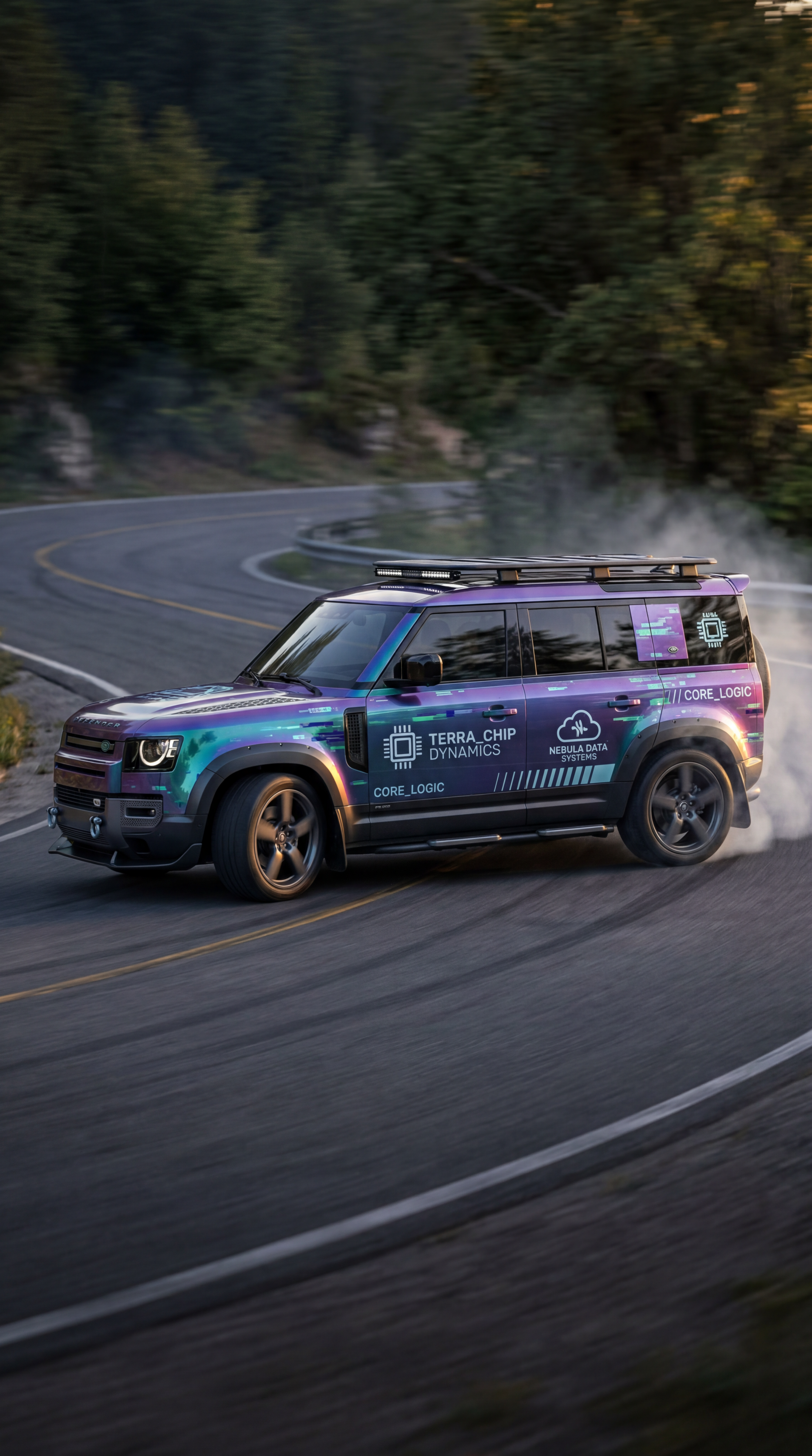 Exterior-only SEO concept render of the Land Rover Defender Concept SUV. Search intent target: "2026 land rover defender concept ev concept". Direction: daily-driver race conversion with practical body kit and street-legal realism. Wrap/livery concept: street drift style with glitch patterns, iridescent vinyl, and stylized faux-brand marks. Overlay plan: tech-company parody overlays: synthetic chip logos, cloud symbols, and code-like stripe systems. Scene: on a mountain touge road with tire smoke and late-evening haze. Camera: wheel-height panning shot with subtle motion blur. Lighting: hard-edged sunset rim light with reflective paint pop. Render style: photoreal EV concept rendering with technical surface detail and precise lighting. Creative hook: race poster energy with layered visual storytelling. Keep it relevant to the search query and avoid duplicating prior visual directions for similar models. If web grounding is available, incorporate up-to-date public facts that support the keyword context and keep claims realistic. Use fictional/parody overlay labels only (no exact trademark logos). No interior views, no cabin, no cockpit, no dashboard, no seats, no people, no explicit smoking act, no watermarks.