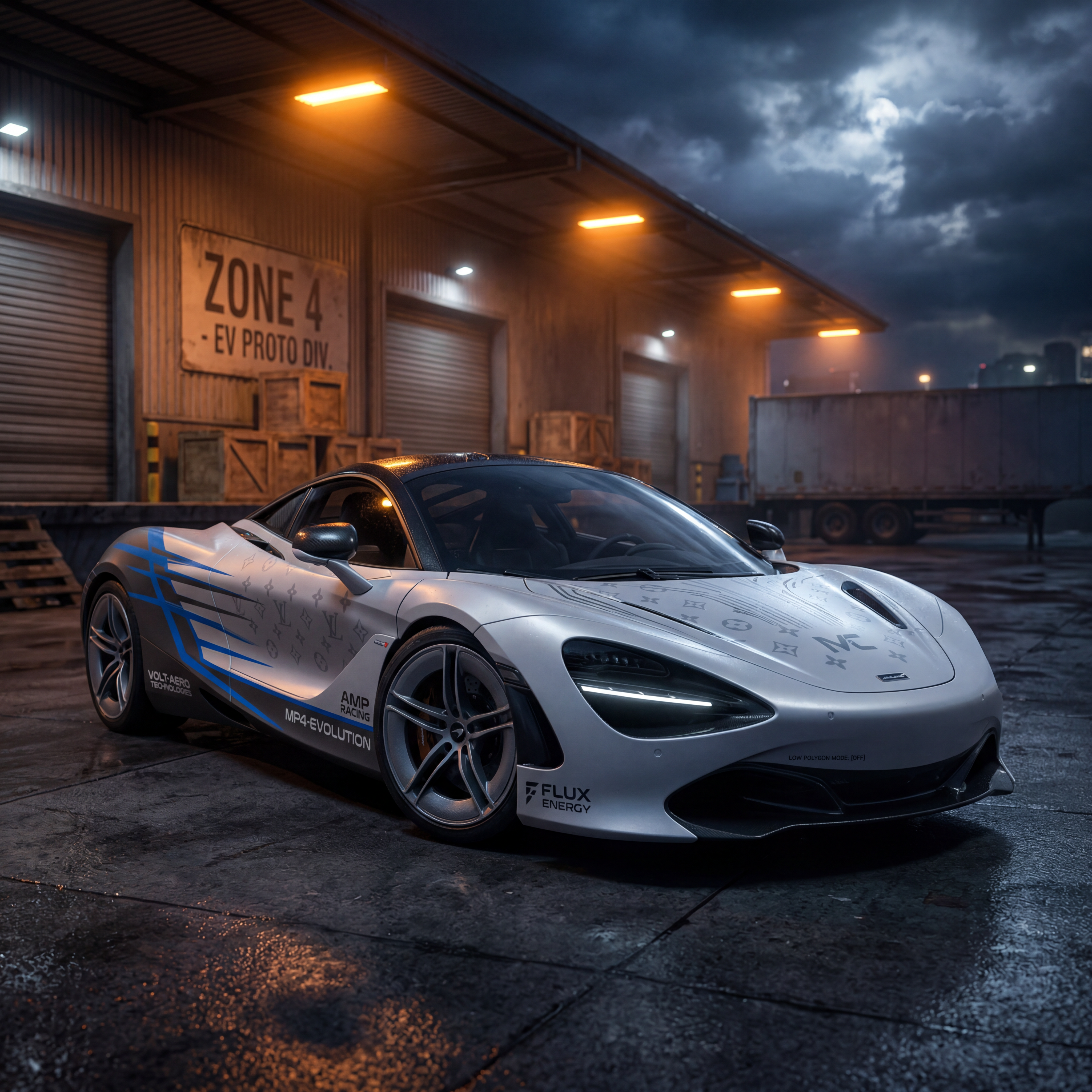 Exterior-only SEO concept render of the McLaren 750S Concept supercar. Search intent target: "2026 mclaren 750s concept redesign". Direction: EV performance identity with technical aero graphics and clean panel geometry. Wrap/livery concept: GT3-inspired livery with layered speed lines, fake team marks, and tire sponsor blocks. Overlay plan: parody luxury-brand monogram overlays with abstract crests and geometric insignias. Scene: inside an industrial loading yard with sodium-vapor night lighting. Camera: low front three-quarter hero angle. Lighting: storm-break dramatic sky with selective specular accents. Render style: photorealistic automotive marketing render with premium detail and realistic materials. Creative hook: meme-ready surprise detail hidden in decals for replay value. Keep it relevant to the search query and avoid duplicating prior visual directions for similar models. If web grounding is available, incorporate up-to-date public facts that support the keyword context and keep claims realistic. Use fictional/parody overlay labels only (no exact trademark logos). No interior views, no cabin, no cockpit, no dashboard, no seats, no people, no explicit smoking act, no watermarks.
