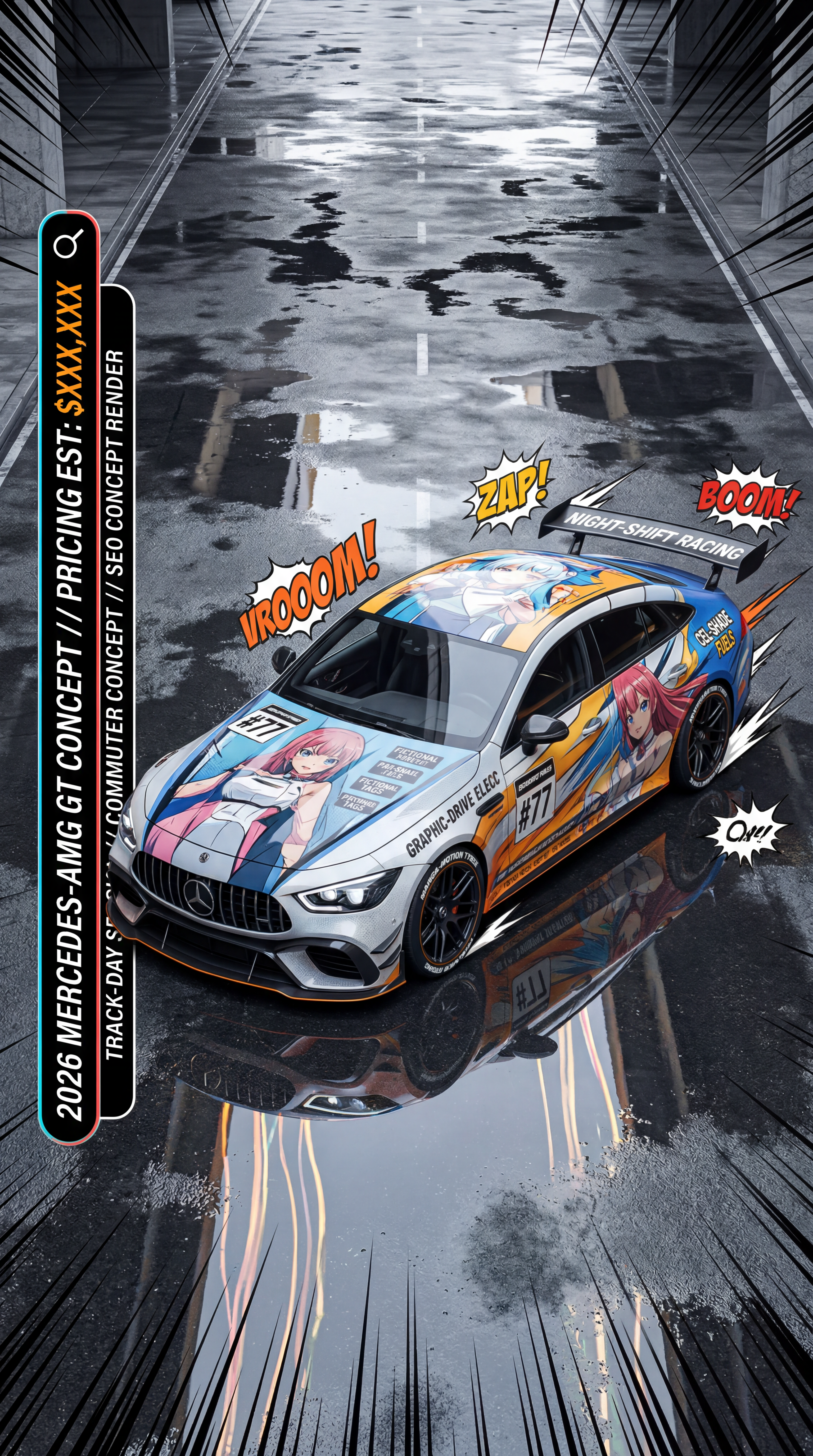 Exterior-only SEO concept render of the Mercedes AMG GT Concept sports car. Search intent target: "2026 mercedes amg gt concept pricing". Direction: track-day special theme for an ordinary commuter car with pro-livery discipline. Wrap/livery concept: anime race-team style with cel-shaded accent graphics and manga motion glyphs. Overlay plan: fake sponsor overlays only: invented team names, fictional partner tags, custom race numbers. Scene: on a wet downtown underpass with reflection-heavy asphalt. Camera: elevated drone-like frame emphasizing livery readability. Lighting: studio-grade key/fill setup adapted to outdoor realism. Render style: premium photoreal luxury campaign render with precise reflections and paint depth. Creative hook: social-carousel friendly crop logic and high color separation. Keep it relevant to the search query and avoid duplicating prior visual directions for similar models. If web grounding is available, incorporate up-to-date public facts that support the keyword context and keep claims realistic. Use fictional/parody overlay labels only (no exact trademark logos). No interior views, no cabin, no cockpit, no dashboard, no seats, no people, no explicit smoking act, no watermarks.