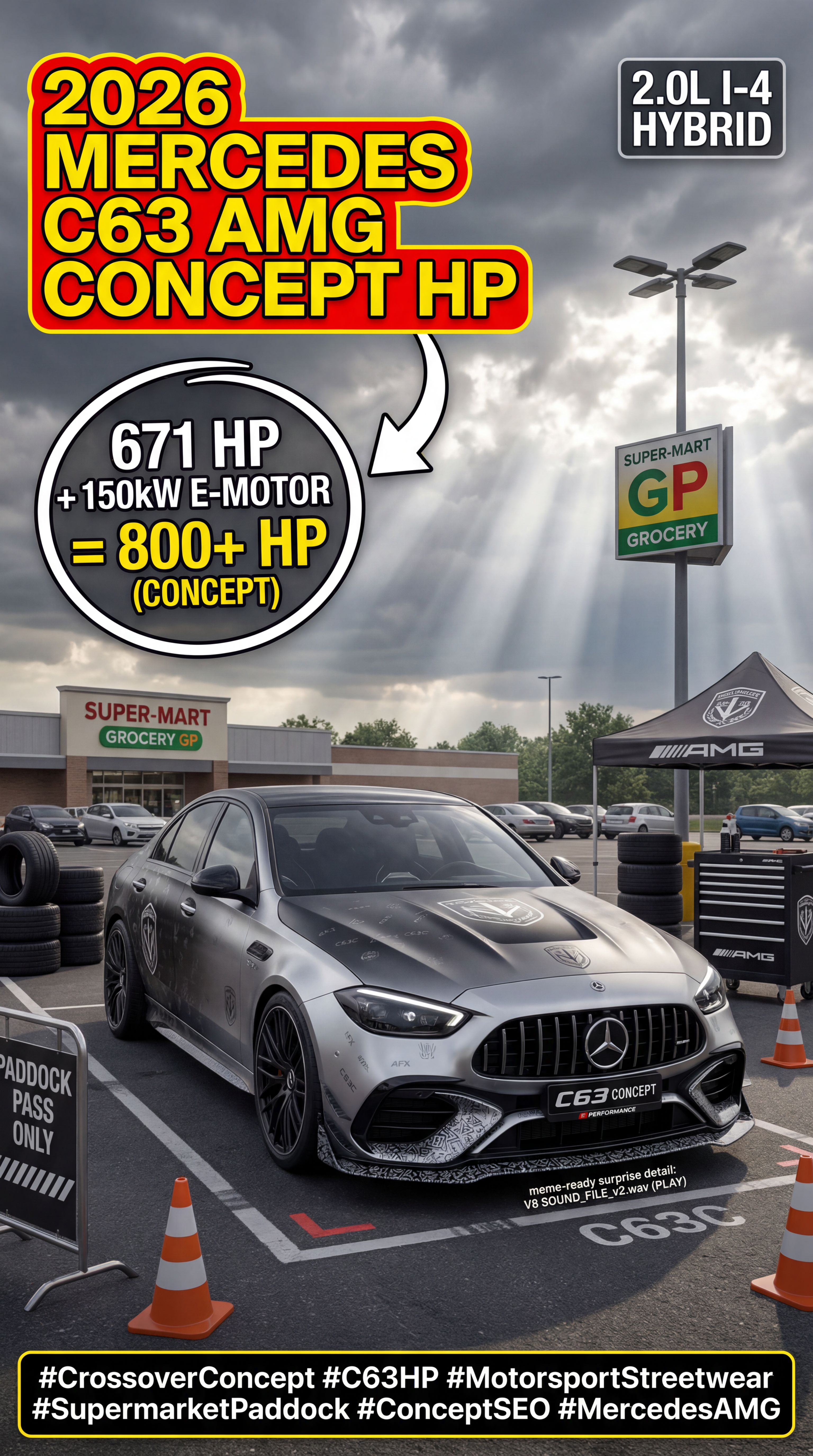 Exterior-only SEO concept render of the Mercedes C63 AMG Concept sports car. Search intent target: "2026 mercedes c63 amg concept hp". Direction: motorsport x streetwear crossover with bold visual hierarchy for thumbnails. Wrap/livery concept: luxury monochrome wrap with satin metallic gradients and subtle pinstriped crest motifs. Overlay plan: parody luxury-brand monogram overlays with abstract crests and geometric insignias. Scene: in a suburban supermarket parking lot staged like a race paddock. Camera: low front three-quarter hero angle. Lighting: storm-break dramatic sky with selective specular accents. Render style: premium photoreal luxury campaign render with precise reflections and paint depth. Creative hook: meme-ready surprise detail hidden in decals for replay value. Keep it relevant to the search query and avoid duplicating prior visual directions for similar models. If web grounding is available, incorporate up-to-date public facts that support the keyword context and keep claims realistic. Use fictional/parody overlay labels only (no exact trademark logos). No interior views, no cabin, no cockpit, no dashboard, no seats, no people, no explicit smoking act, no watermarks.