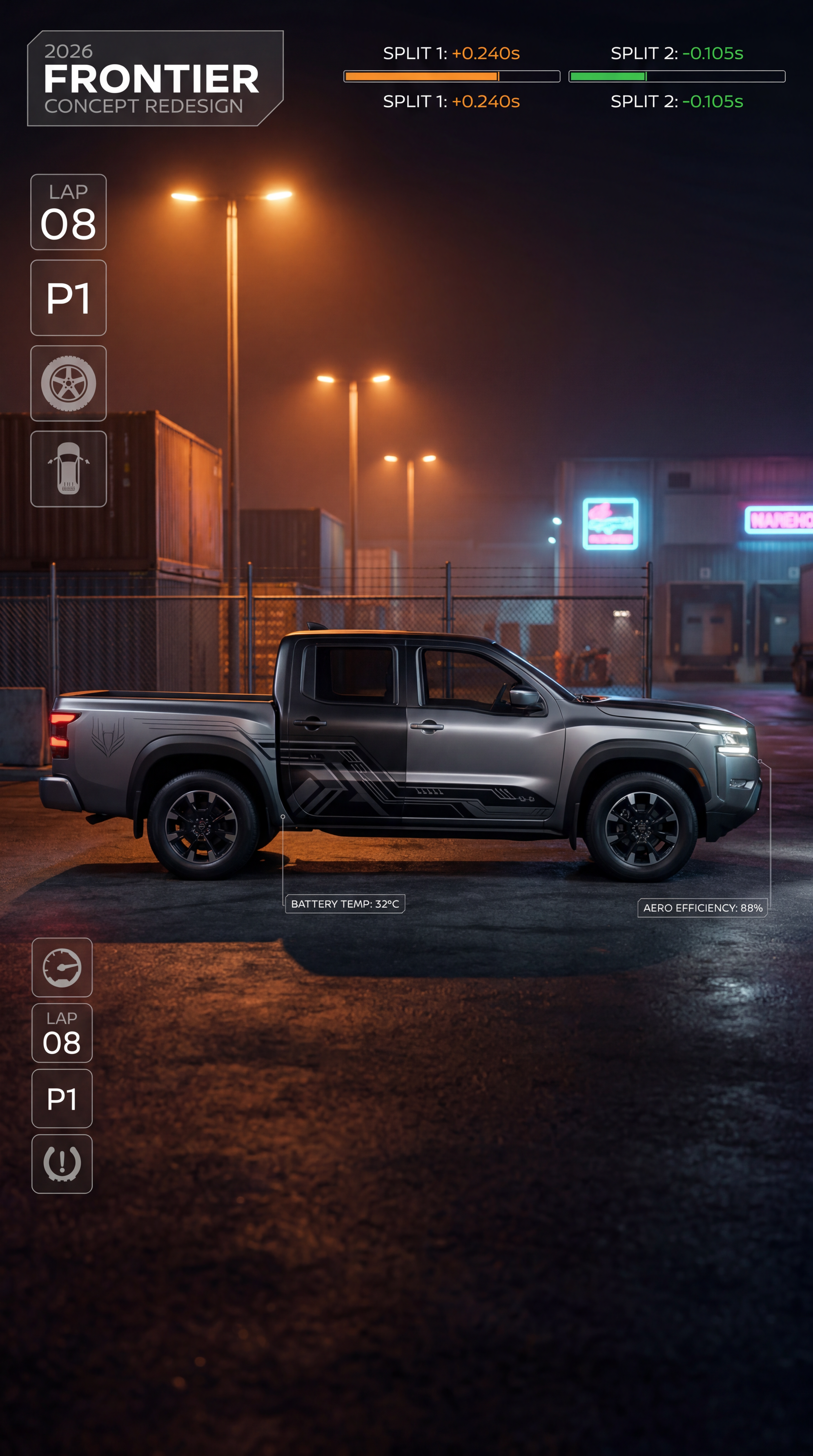 Exterior-only SEO concept render of the Nissan Frontier Concept pickup truck. Search intent target: "2026 nissan frontier concept redesign". Direction: EV performance identity with technical aero graphics and clean panel geometry. Wrap/livery concept: luxury monochrome wrap with satin metallic gradients and subtle pinstriped crest motifs. Overlay plan: motorsport telemetry overlays: faux pit board icons, lap split bars, and setup labels. Scene: inside an industrial loading yard with sodium-vapor night lighting. Camera: tight side profile with long lens compression. Lighting: nighttime neon contrast with controlled bloom. Render style: photorealistic automotive marketing render with premium detail and realistic materials. Creative hook: thumbnail-first composition with immediate visual hierarchy. Keep it relevant to the search query and avoid duplicating prior visual directions for similar models. If web grounding is available, incorporate up-to-date public facts that support the keyword context and keep claims realistic. Use fictional/parody overlay labels only (no exact trademark logos). No interior views, no cabin, no cockpit, no dashboard, no seats, no people, no explicit smoking act, no watermarks.