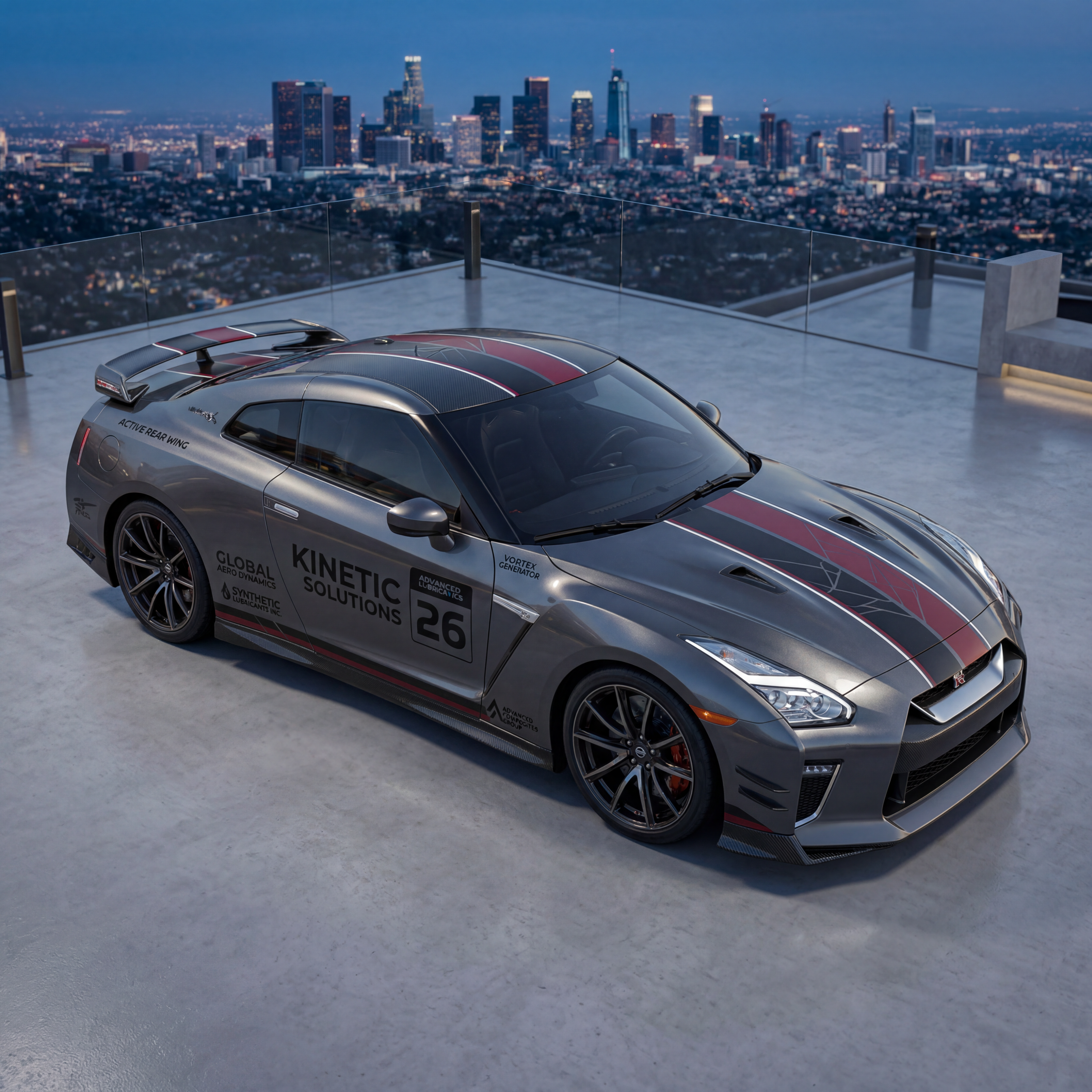 Exterior-only SEO concept render of the Nissan GT-R R36 Concept supercar. Search intent target: "2026 nissan gt-r r36 concept specs". Direction: premium luxury hero concept with restrained high-end detailing. Wrap/livery concept: heritage endurance stripes with contemporary geometry and polished aero callouts. Overlay plan: fake sponsor overlays only: invented team names, fictional partner tags, custom race numbers. Scene: at a city rooftop event space with cinematic skyline backplate. Camera: elevated drone-like frame emphasizing livery readability. Lighting: studio-grade key/fill setup adapted to outdoor realism. Render style: photorealistic automotive marketing render with premium detail and realistic materials. Creative hook: social-carousel friendly crop logic and high color separation. Keep it relevant to the search query and avoid duplicating prior visual directions for similar models. If web grounding is available, incorporate up-to-date public facts that support the keyword context and keep claims realistic. Use fictional/parody overlay labels only (no exact trademark logos). No interior views, no cabin, no cockpit, no dashboard, no seats, no people, no explicit smoking act, no watermarks.