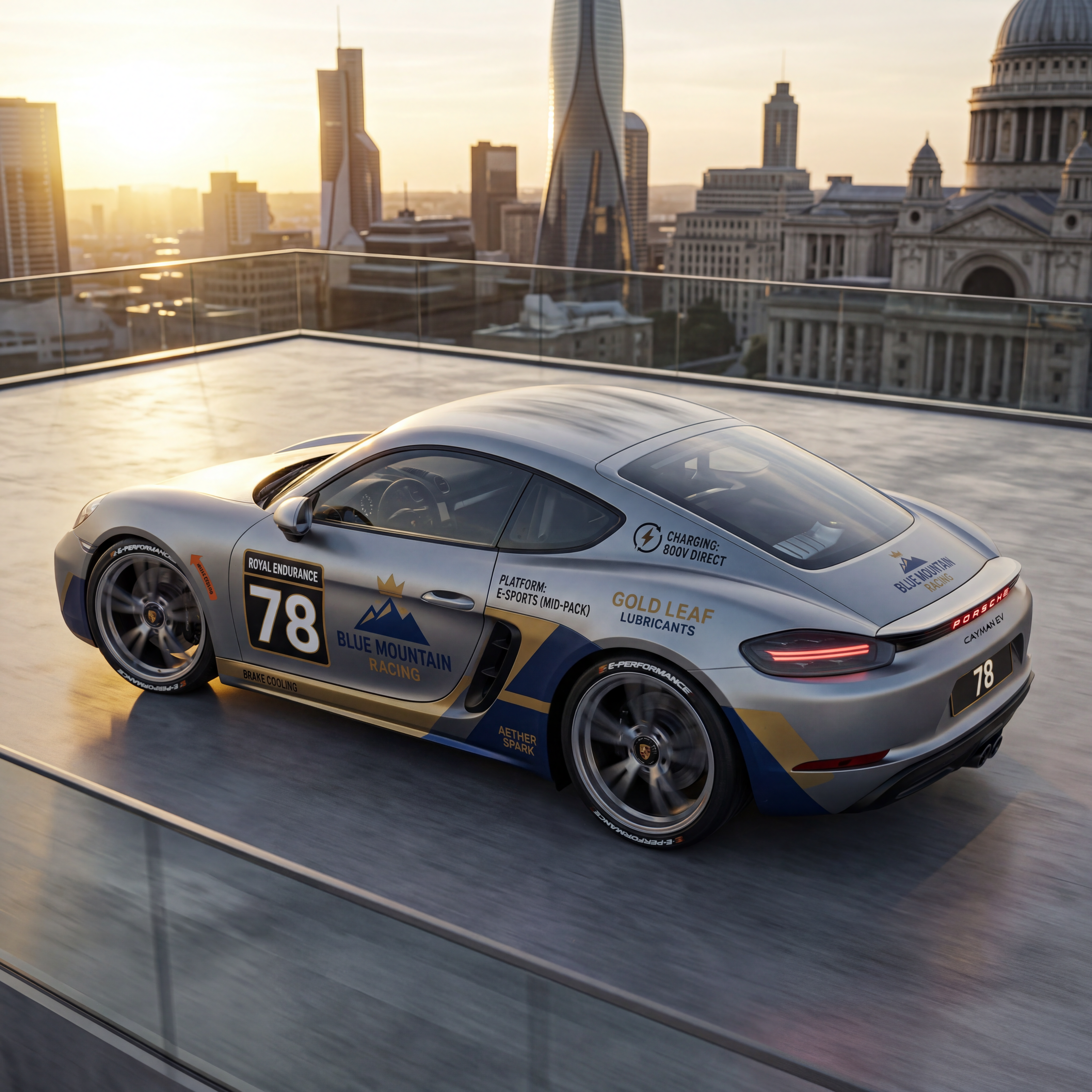 Exterior-only SEO concept render of the Porsche Cayman EV Concept sports car. Search intent target: "2026 porsche cayman ev concept specs". Direction: premium luxury hero concept with restrained high-end detailing. Wrap/livery concept: minimal endurance-racing template with high-contrast number plates and brake-cooling arrows. Overlay plan: fictional tobacco-inspired retro decals (no real trademarks) with distressed print texture. Scene: at a city rooftop event space with cinematic skyline backplate. Camera: high rear three-quarter rolling follow shot. Lighting: golden-hour directional light with long highlights. Render style: photoreal EV concept rendering with technical surface detail and precise lighting. Creative hook: premium configurator realism with showroom polish. Keep it relevant to the search query and avoid duplicating prior visual directions for similar models. If web grounding is available, incorporate up-to-date public facts that support the keyword context and keep claims realistic. Use fictional/parody overlay labels only (no exact trademark logos). No interior views, no cabin, no cockpit, no dashboard, no seats, no people, no explicit smoking act, no watermarks.