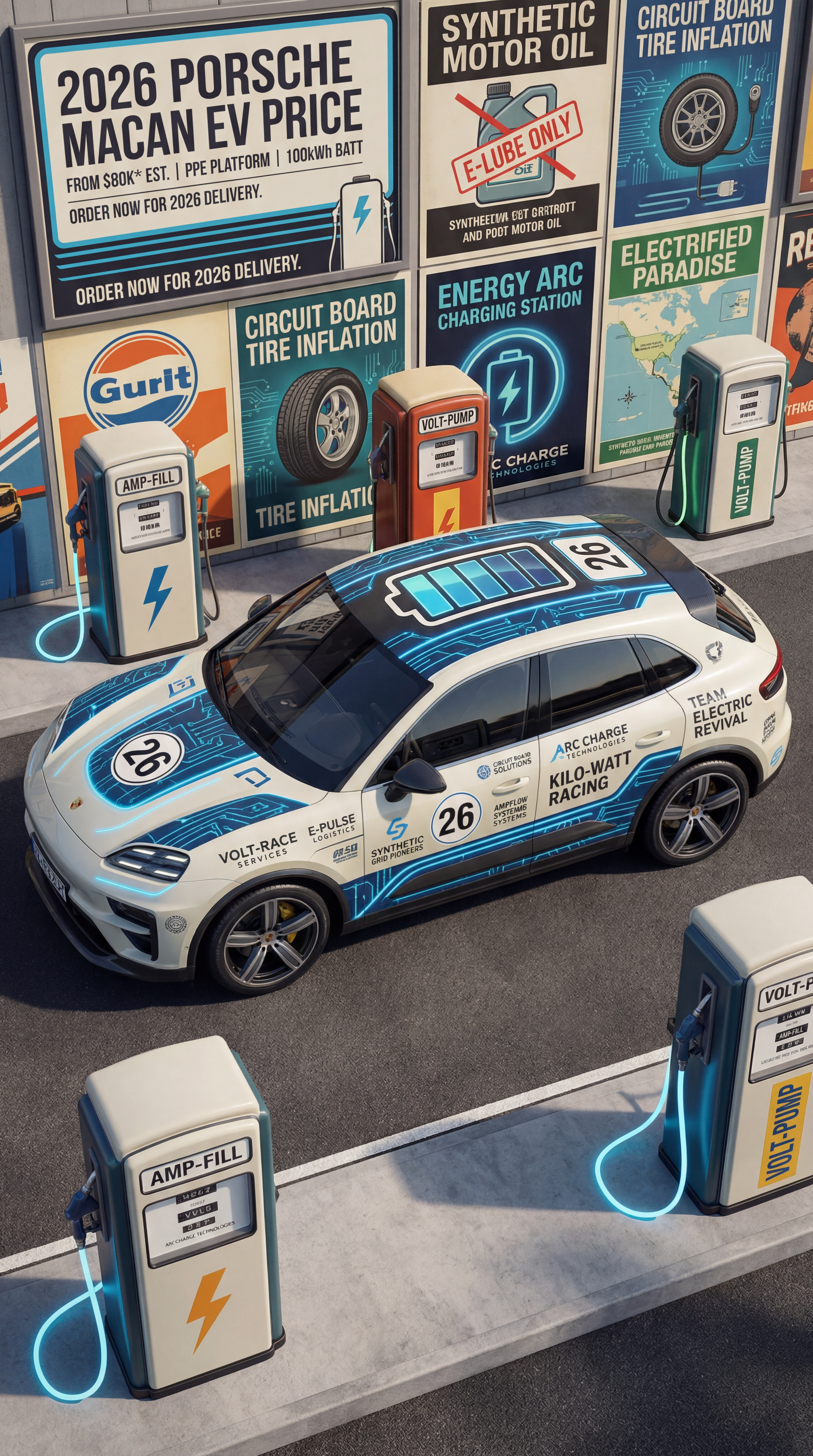 Exterior-only SEO concept render of the Porsche Macan EV Concept SUV. Search intent target: "2026 porsche macan ev concept price". Direction: retro motorsport revival with modern materials and period-correct composition. Wrap/livery concept: EV circuit-board graphics with battery-cell iconography and synthetic energy arcs. Overlay plan: fake sponsor overlays only: invented team names, fictional partner tags, custom race numbers. Scene: at a small-town fuel station styled as a retro poster set. Camera: elevated drone-like frame emphasizing livery readability. Lighting: studio-grade key/fill setup adapted to outdoor realism. Render style: photoreal EV concept rendering with technical surface detail and precise lighting. Creative hook: social-carousel friendly crop logic and high color separation. Keep it relevant to the search query and avoid duplicating prior visual directions for similar models. If web grounding is available, incorporate up-to-date public facts that support the keyword context and keep claims realistic. Use fictional/parody overlay labels only (no exact trademark logos). No interior views, no cabin, no cockpit, no dashboard, no seats, no people, no explicit smoking act, no watermarks.