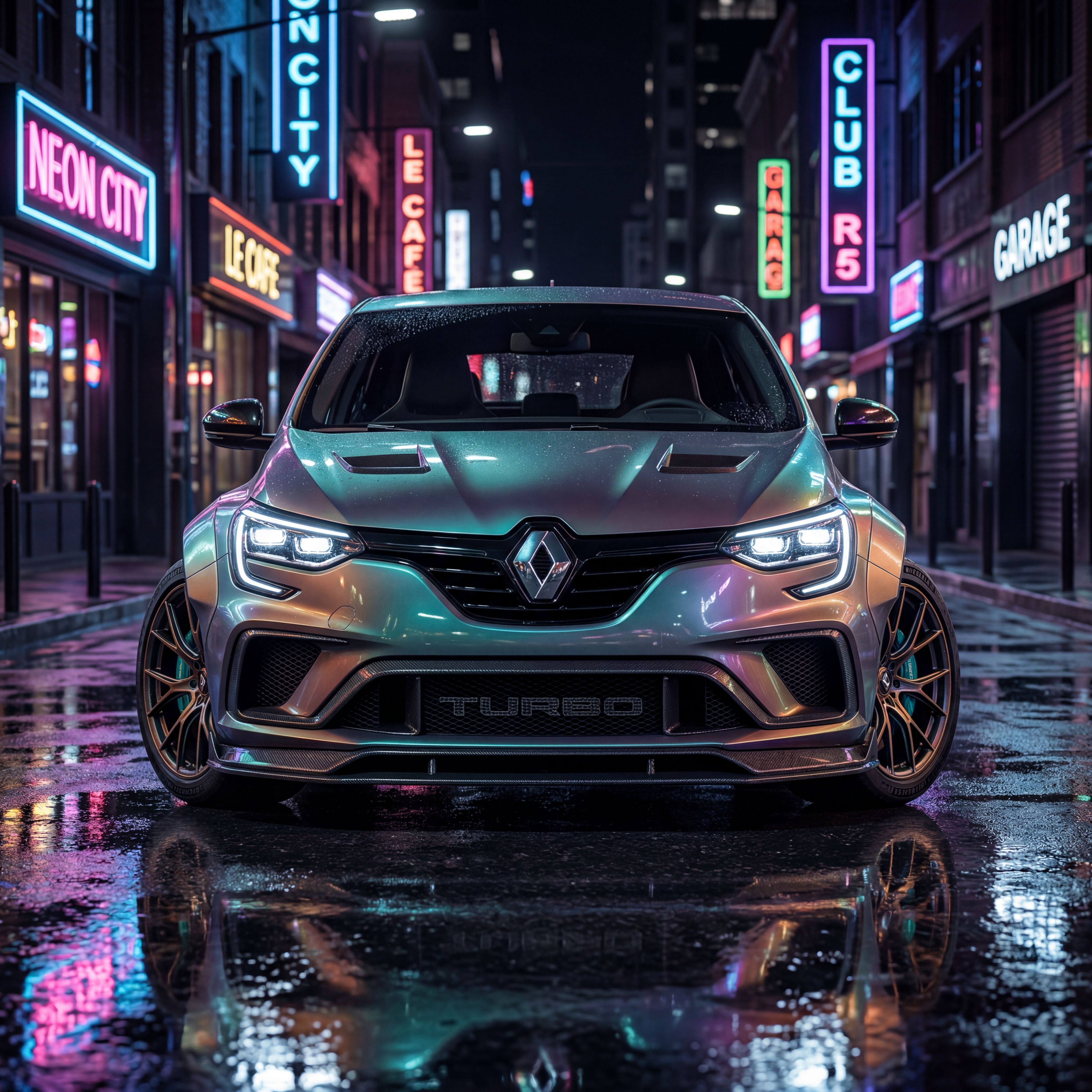 Exterior-only concept render of the 2026 Renault 5 Turbo EV Concept electric vehicle, captured head-on with aggressive, symmetrical framing, on a neon-lit downtown street after rain with mirror-like reflections. Render style: photorealistic automotive marketing render with premium detail and realistic materials. Wrap direction: chameleon wrap shifting between teal, bronze, and violet tones. high-contrast studio-grade lighting adapted for outdoor realism. Premium automotive marketing image for PSEO intent around "2026 renault 5 turbo ev concept specs" and related car model searches. No interior views, no cabin, no cockpit, no dashboard, no seats, no people, no text overlays, no logos, no watermarks.