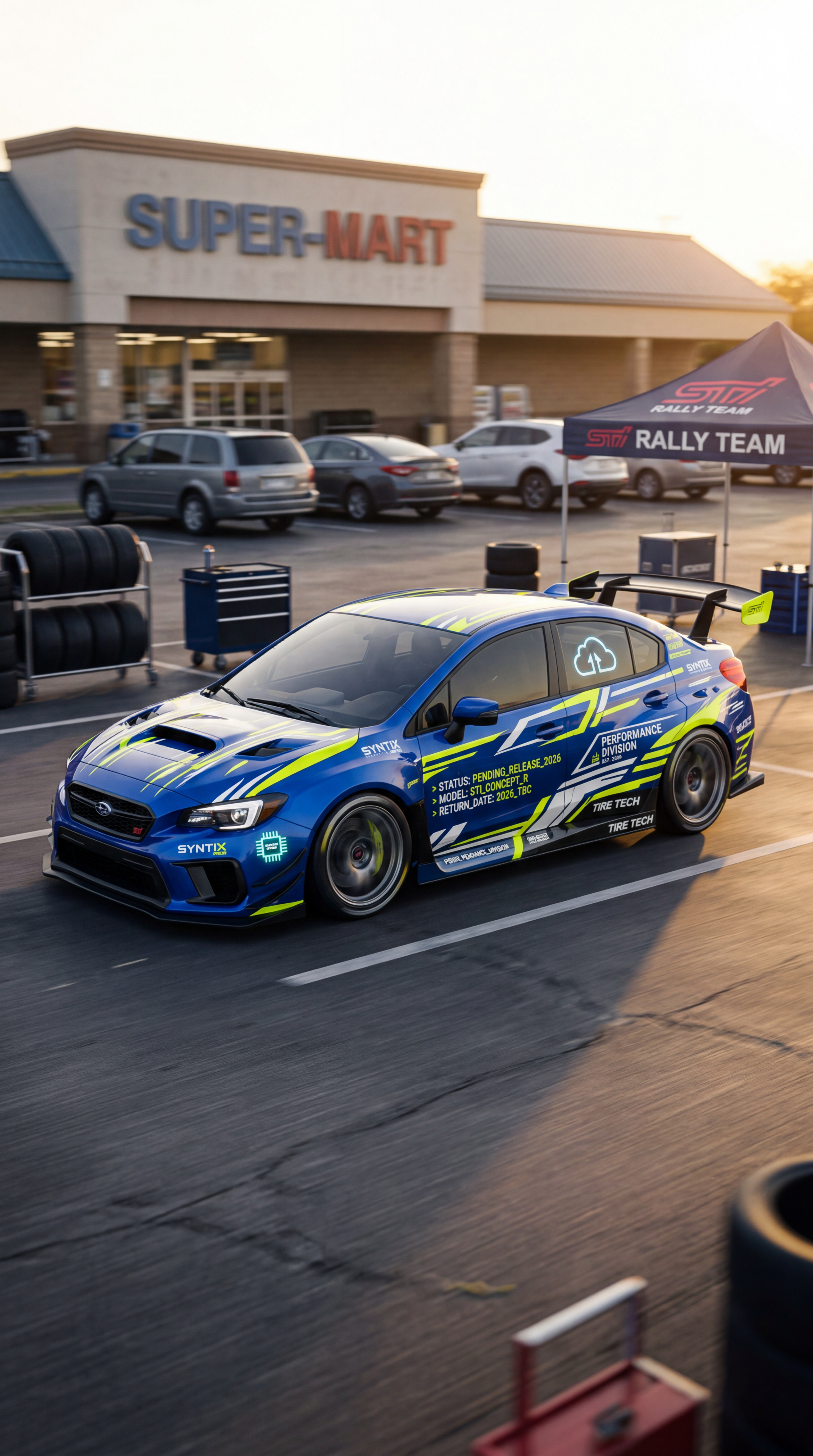 Exterior-only SEO concept render of the Subaru WRX STI Concept sports car. Search intent target: "2026 subaru wrx sti concept return date". Direction: motorsport x streetwear crossover with bold visual hierarchy for thumbnails. Wrap/livery concept: GT3-inspired livery with layered speed lines, fake team marks, and tire sponsor blocks. Overlay plan: tech-company parody overlays: synthetic chip logos, cloud symbols, and code-like stripe systems. Scene: in a suburban supermarket parking lot staged like a race paddock. Camera: wheel-height panning shot with subtle motion blur. Lighting: hard-edged sunset rim light with reflective paint pop. Render style: photorealistic automotive marketing render with premium detail and realistic materials. Creative hook: race poster energy with layered visual storytelling. Keep it relevant to the search query and avoid duplicating prior visual directions for similar models. If web grounding is available, incorporate up-to-date public facts that support the keyword context and keep claims realistic. Use fictional/parody overlay labels only (no exact trademark logos). No interior views, no cabin, no cockpit, no dashboard, no seats, no people, no explicit smoking act, no watermarks.