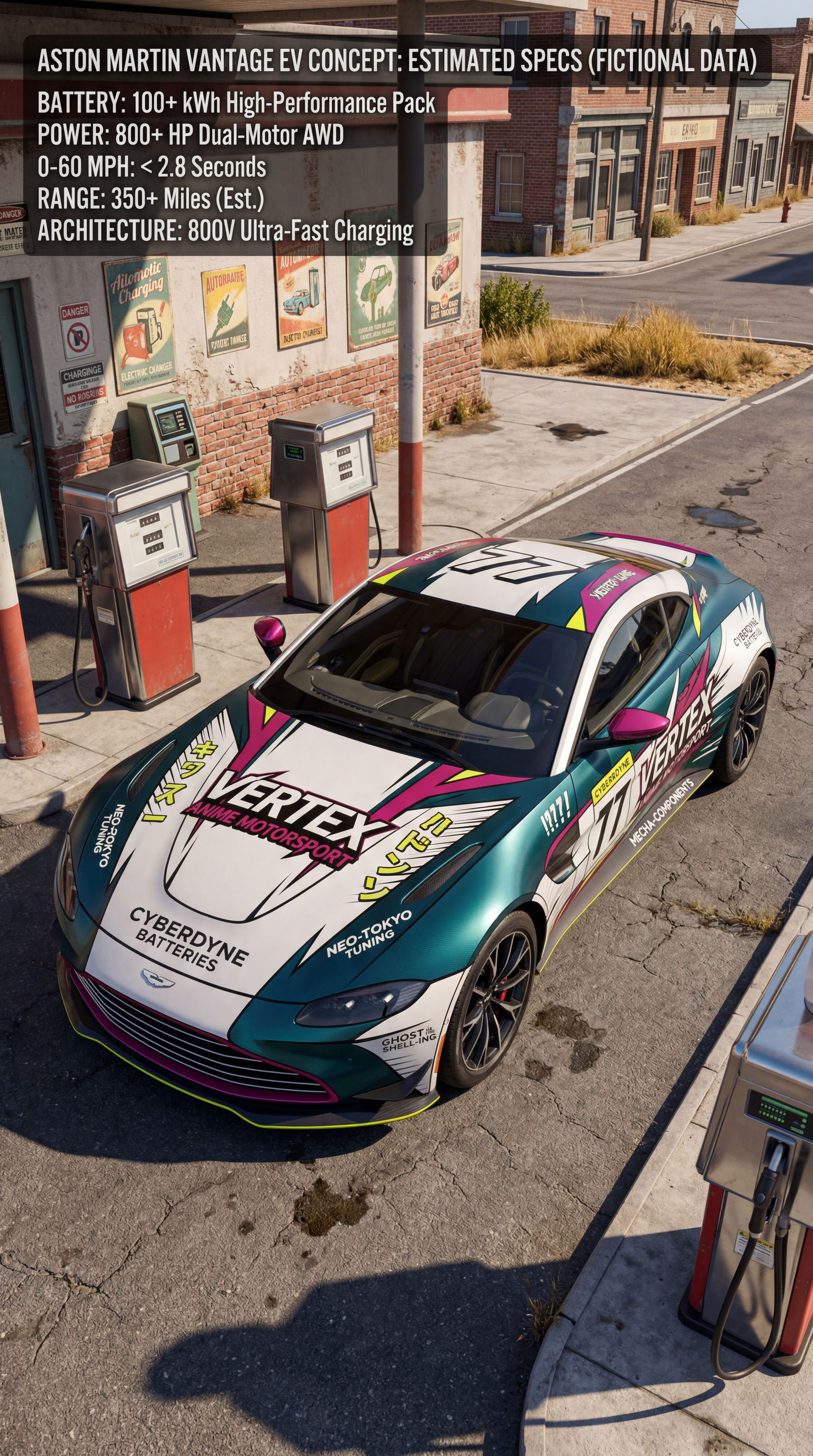 Exterior-only SEO concept render of the Aston Martin Vantage Concept sports car. Search intent target: "aston martin vantage concept ev specs". Direction: retro motorsport revival with modern materials and period-correct composition. Wrap/livery concept: anime race-team style with cel-shaded accent graphics and manga motion glyphs. Overlay plan: fake sponsor overlays only: invented team names, fictional partner tags, custom race numbers. Scene: at a small-town fuel station styled as a retro poster set. Camera: elevated drone-like frame emphasizing livery readability. Lighting: studio-grade key/fill setup adapted to outdoor realism. Render style: photoreal EV concept rendering with technical surface detail and precise lighting. Creative hook: social-carousel friendly crop logic and high color separation. Keep it relevant to the search query and avoid duplicating prior visual directions for similar models. If web grounding is available, incorporate up-to-date public facts that support the keyword context and keep claims realistic. Use fictional/parody overlay labels only (no exact trademark logos). No interior views, no cabin, no cockpit, no dashboard, no seats, no people, no explicit smoking act, no watermarks.