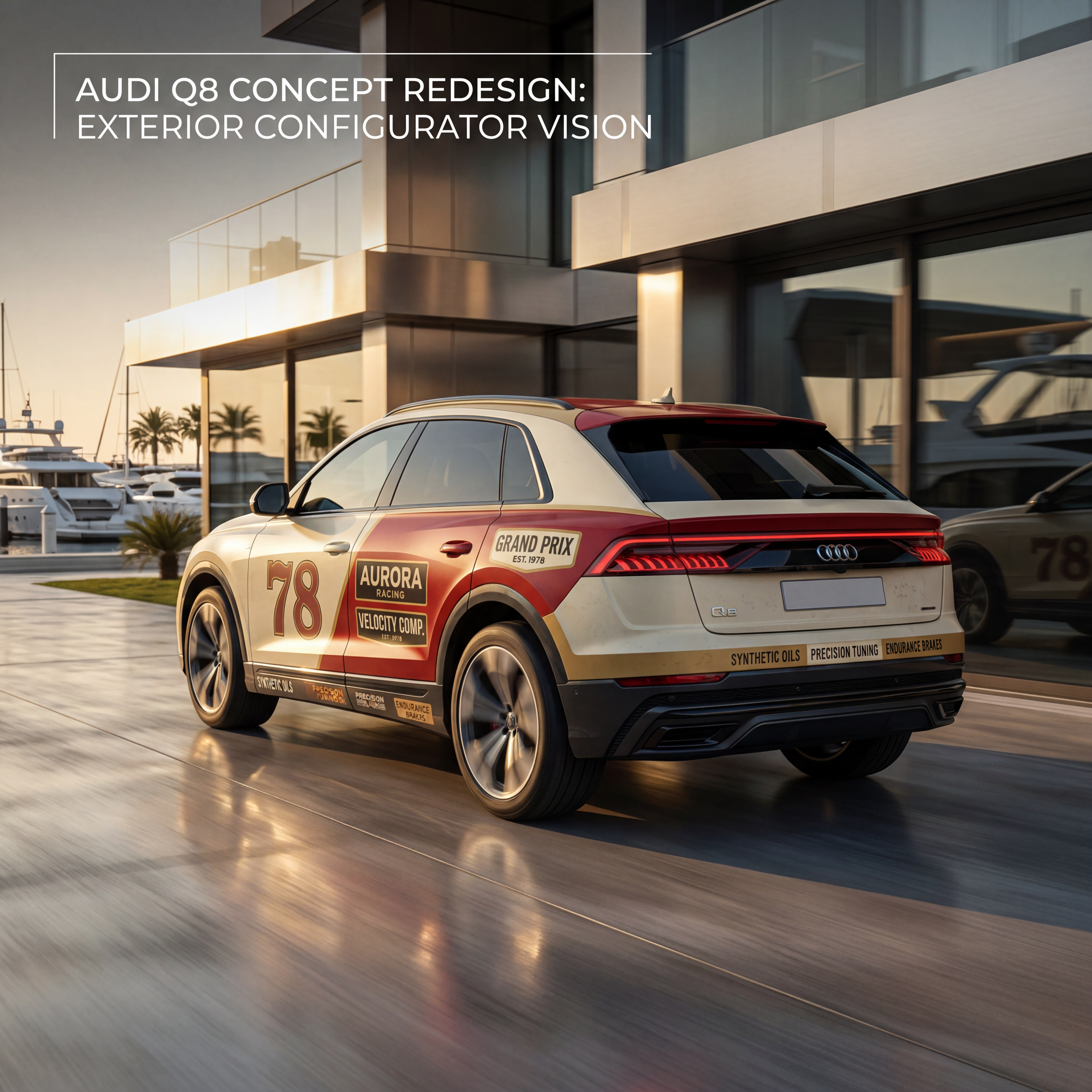 Exterior-only SEO concept render of the Audi Q8 Concept SUV. Search intent target: "audi q8 concept redesign". Direction: showroom launch visual with high CTR composition for image search. Wrap/livery concept: retro tobacco-era color blocking with fictional cigarette-style sponsor rectangles and no real logos. Overlay plan: fictional tobacco-inspired retro decals (no real trademarks) with distressed print texture. Scene: outside a luxury marina with polished concrete and glass facades. Camera: high rear three-quarter rolling follow shot. Lighting: golden-hour directional light with long highlights. Render style: premium photoreal luxury campaign render with precise reflections and paint depth. Creative hook: premium configurator realism with showroom polish. Keep it relevant to the search query and avoid duplicating prior visual directions for similar models. If web grounding is available, incorporate up-to-date public facts that support the keyword context and keep claims realistic. Use fictional/parody overlay labels only (no exact trademark logos). No interior views, no cabin, no cockpit, no dashboard, no seats, no people, no explicit smoking act, no watermarks.