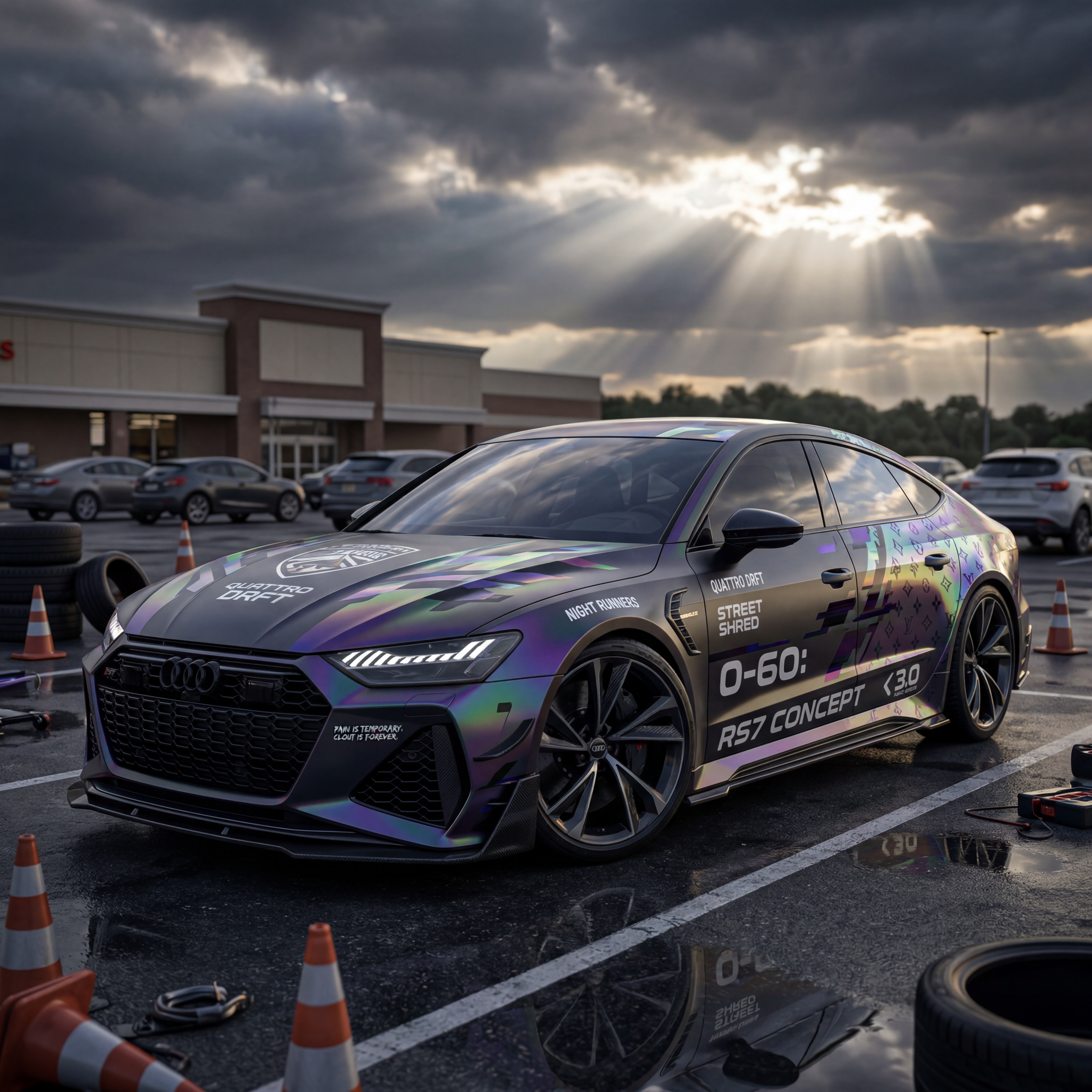 Exterior-only SEO concept render of the Audi RS7 Concept sports car. Search intent target: "audi rs7 concept 0-60". Direction: motorsport x streetwear crossover with bold visual hierarchy for thumbnails. Wrap/livery concept: street drift style with glitch patterns, iridescent vinyl, and stylized faux-brand marks. Overlay plan: parody luxury-brand monogram overlays with abstract crests and geometric insignias. Scene: in a suburban supermarket parking lot staged like a race paddock. Camera: low front three-quarter hero angle. Lighting: storm-break dramatic sky with selective specular accents. Render style: premium photoreal luxury campaign render with precise reflections and paint depth. Creative hook: meme-ready surprise detail hidden in decals for replay value. Keep it relevant to the search query and avoid duplicating prior visual directions for similar models. If web grounding is available, incorporate up-to-date public facts that support the keyword context and keep claims realistic. Use fictional/parody overlay labels only (no exact trademark logos). No interior views, no cabin, no cockpit, no dashboard, no seats, no people, no explicit smoking act, no watermarks.