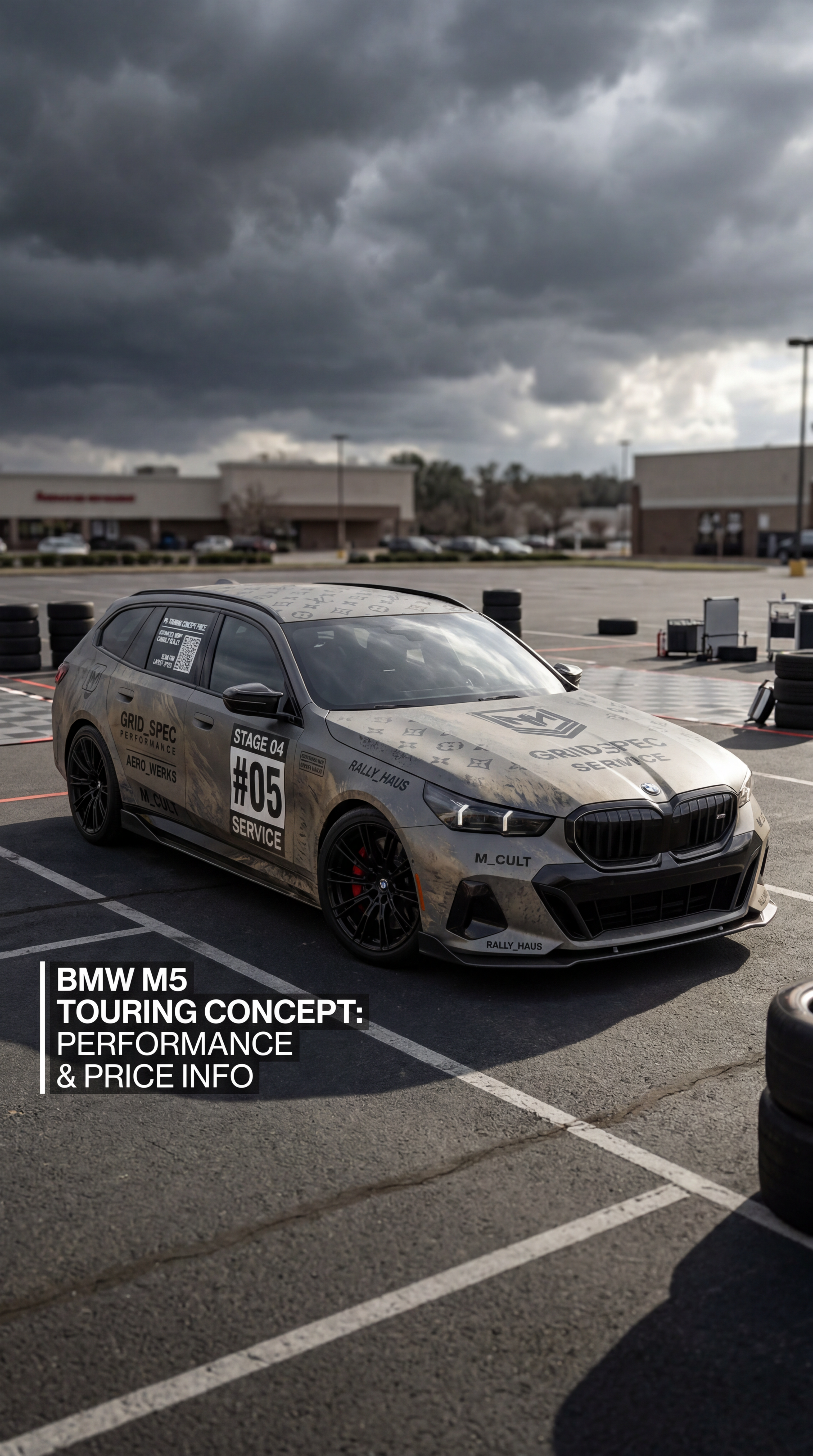 Exterior-only SEO concept render of the BMW M5 Touring Concept performance wagon. Search intent target: "bmw m5 touring concept price". Direction: motorsport x streetwear crossover with bold visual hierarchy for thumbnails. Wrap/livery concept: rally mud-splatter narrative wrap with fake stage numbers and service-crew decals. Overlay plan: parody luxury-brand monogram overlays with abstract crests and geometric insignias. Scene: in a suburban supermarket parking lot staged like a race paddock. Camera: low front three-quarter hero angle. Lighting: storm-break dramatic sky with selective specular accents. Render style: premium photoreal luxury campaign render with precise reflections and paint depth. Creative hook: meme-ready surprise detail hidden in decals for replay value. Keep it relevant to the search query and avoid duplicating prior visual directions for similar models. If web grounding is available, incorporate up-to-date public facts that support the keyword context and keep claims realistic. Use fictional/parody overlay labels only (no exact trademark logos). No interior views, no cabin, no cockpit, no dashboard, no seats, no people, no explicit smoking act, no watermarks.