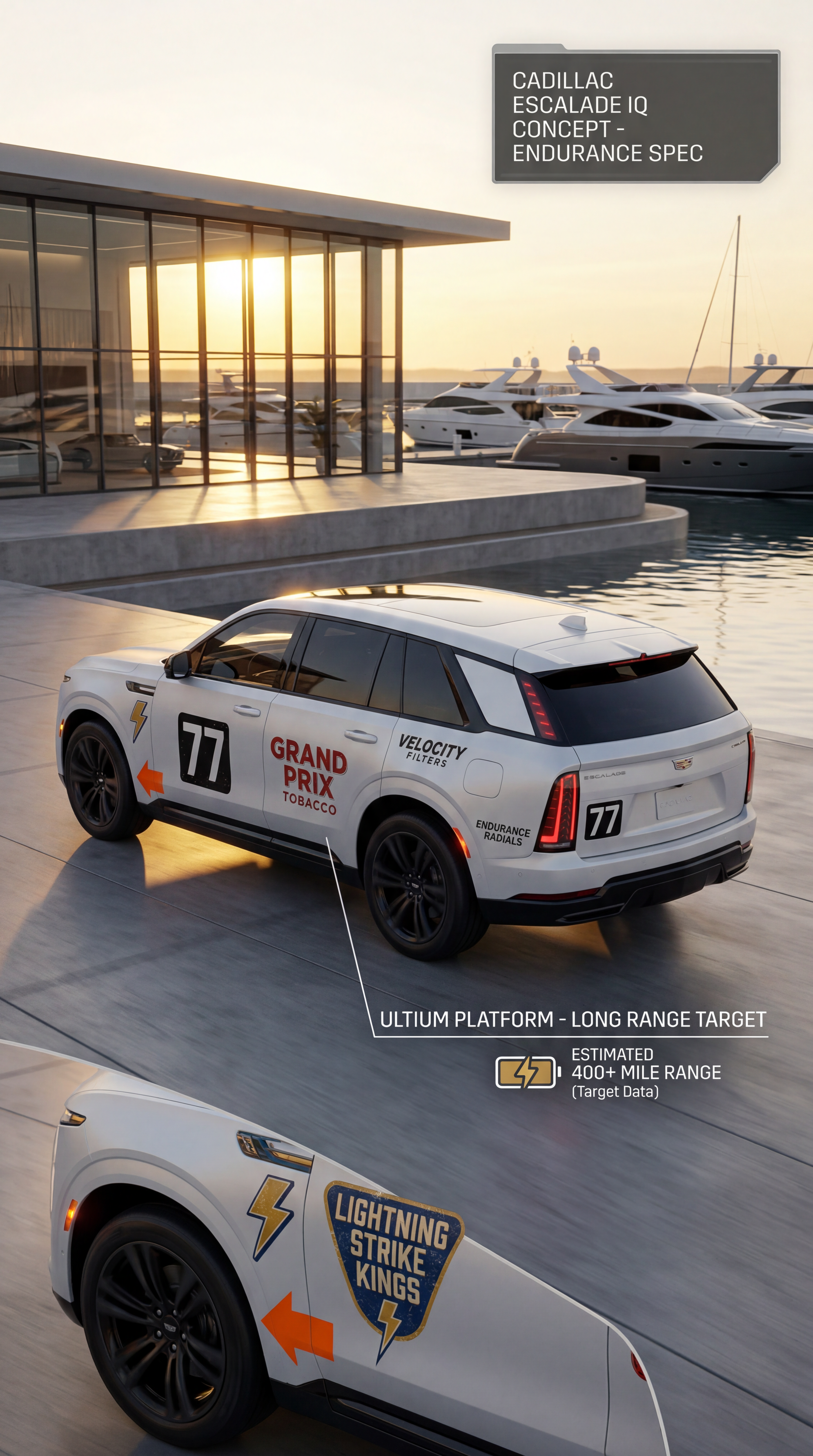Exterior-only SEO concept render of the Cadillac Escalade IQ Concept SUV. Search intent target: "cadillac escalade iq concept range". Direction: showroom launch visual with high CTR composition for image search. Wrap/livery concept: minimal endurance-racing template with high-contrast number plates and brake-cooling arrows. Overlay plan: fictional tobacco-inspired retro decals (no real trademarks) with distressed print texture. Scene: outside a luxury marina with polished concrete and glass facades. Camera: high rear three-quarter rolling follow shot. Lighting: golden-hour directional light with long highlights. Render style: photorealistic automotive marketing render with premium detail and realistic materials. Creative hook: premium configurator realism with showroom polish. Keep it relevant to the search query and avoid duplicating prior visual directions for similar models. If web grounding is available, incorporate up-to-date public facts that support the keyword context and keep claims realistic. Use fictional/parody overlay labels only (no exact trademark logos). No interior views, no cabin, no cockpit, no dashboard, no seats, no people, no explicit smoking act, no watermarks.