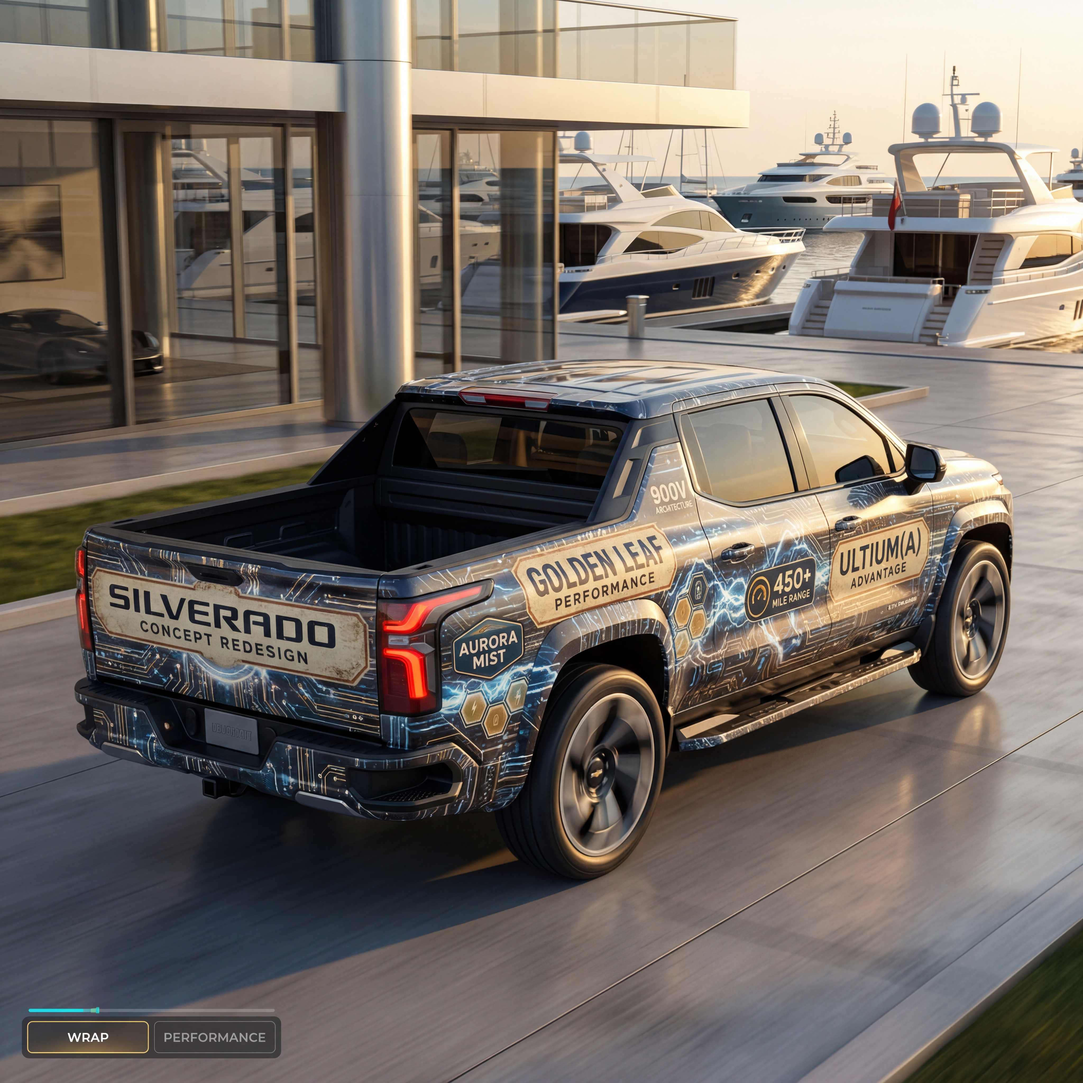 Exterior-only SEO concept render of the Chevrolet Silverado Concept pickup truck. Search intent target: "chevrolet silverado concept redesign". Direction: showroom launch visual with high CTR composition for image search. Wrap/livery concept: EV circuit-board graphics with battery-cell iconography and synthetic energy arcs. Overlay plan: fictional tobacco-inspired retro decals (no real trademarks) with distressed print texture. Scene: outside a luxury marina with polished concrete and glass facades. Camera: high rear three-quarter rolling follow shot. Lighting: golden-hour directional light with long highlights. Render style: photoreal EV concept rendering with technical surface detail and precise lighting. Creative hook: premium configurator realism with showroom polish. Keep it relevant to the search query and avoid duplicating prior visual directions for similar models. If web grounding is available, incorporate up-to-date public facts that support the keyword context and keep claims realistic. Use fictional/parody overlay labels only (no exact trademark logos). No interior views, no cabin, no cockpit, no dashboard, no seats, no people, no explicit smoking act, no watermarks.