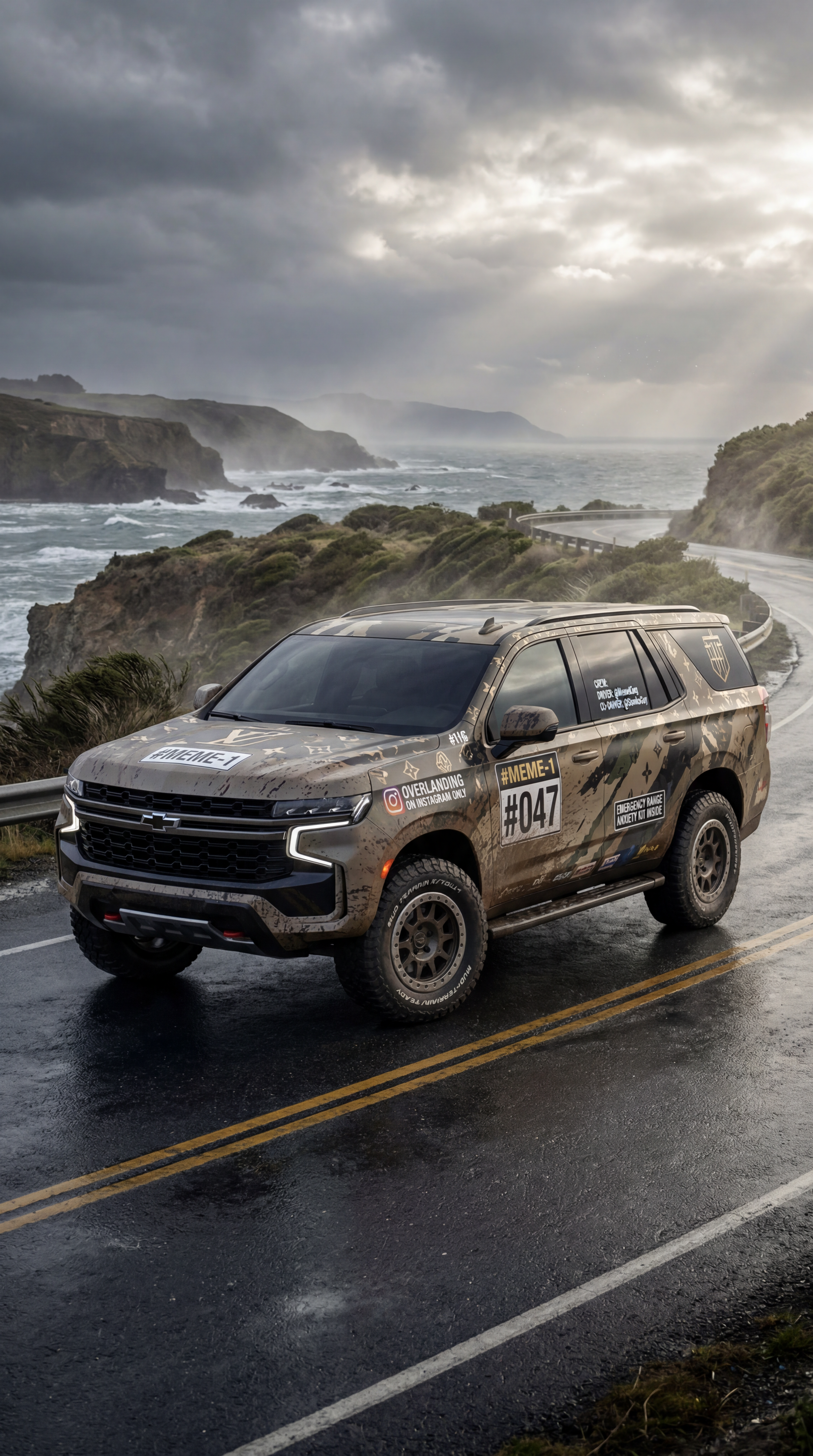 Exterior-only SEO concept render of the Chevrolet Tahoe Concept SUV. Search intent target: "chevrolet tahoe concept price". Direction: funny parody wrap concept built for viral social sharing and meme intent. Wrap/livery concept: rally mud-splatter narrative wrap with fake stage numbers and service-crew decals. Overlay plan: parody luxury-brand monogram overlays with abstract crests and geometric insignias. Scene: on a coastal highway with windblown mist and dramatic cloud breakup. Camera: low front three-quarter hero angle. Lighting: storm-break dramatic sky with selective specular accents. Render style: photoreal EV concept rendering with technical surface detail and precise lighting. Creative hook: meme-ready surprise detail hidden in decals for replay value. Keep it relevant to the search query and avoid duplicating prior visual directions for similar models. If web grounding is available, incorporate up-to-date public facts that support the keyword context and keep claims realistic. Use fictional/parody overlay labels only (no exact trademark logos). No interior views, no cabin, no cockpit, no dashboard, no seats, no people, no explicit smoking act, no watermarks.