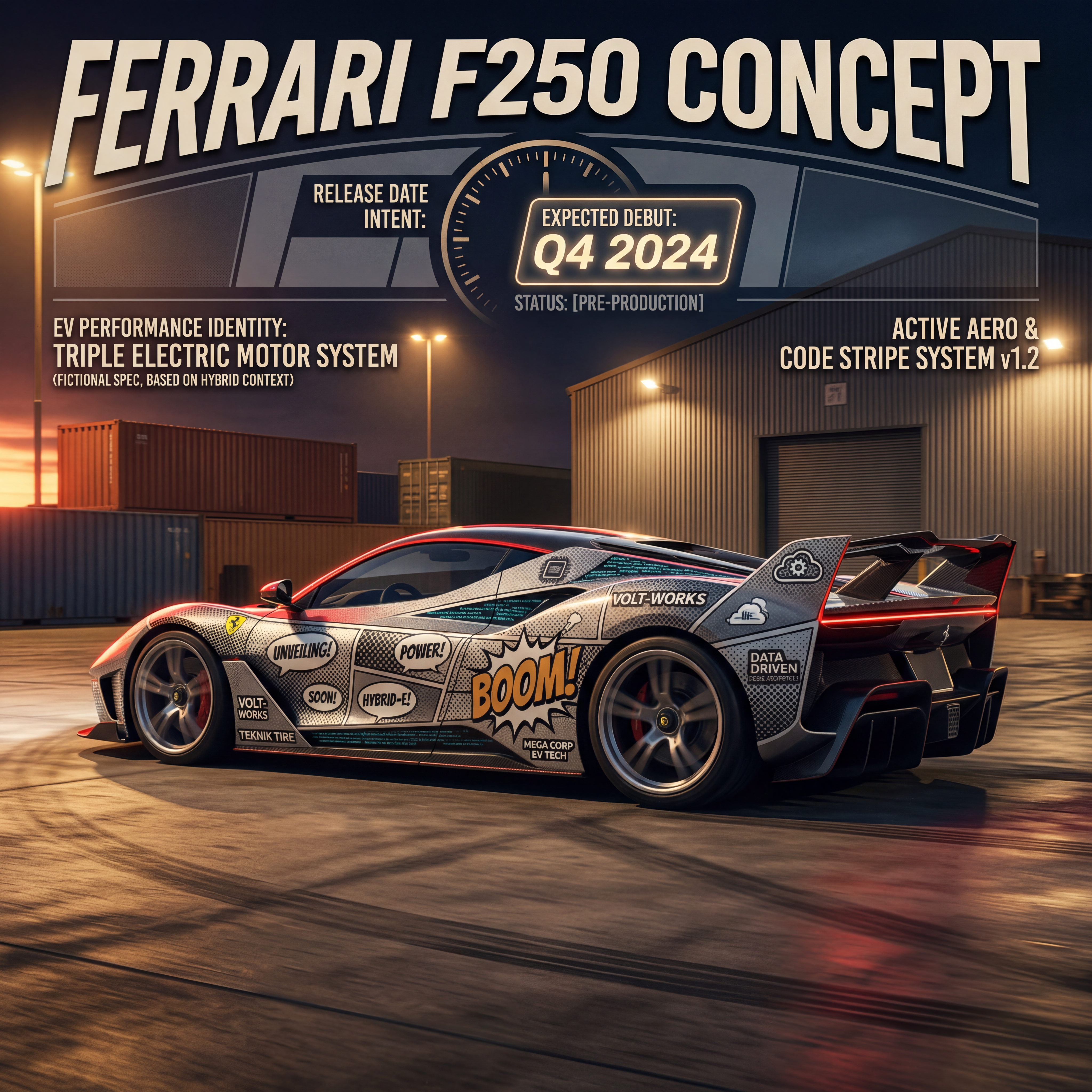 Exterior-only SEO concept render of the Ferrari F250 Concept hypercar. Search intent target: "ferrari f250 concept release date". Direction: EV performance identity with technical aero graphics and clean panel geometry. Wrap/livery concept: comic-book halftone impact panels with parody sponsor badges and speech-bubble icons. Overlay plan: tech-company parody overlays: synthetic chip logos, cloud symbols, and code-like stripe systems. Scene: inside an industrial loading yard with sodium-vapor night lighting. Camera: wheel-height panning shot with subtle motion blur. Lighting: hard-edged sunset rim light with reflective paint pop. Render style: photorealistic automotive marketing render with premium detail and realistic materials. Creative hook: race poster energy with layered visual storytelling. Keep it relevant to the search query and avoid duplicating prior visual directions for similar models. If web grounding is available, incorporate up-to-date public facts that support the keyword context and keep claims realistic. Use fictional/parody overlay labels only (no exact trademark logos). No interior views, no cabin, no cockpit, no dashboard, no seats, no people, no explicit smoking act, no watermarks.