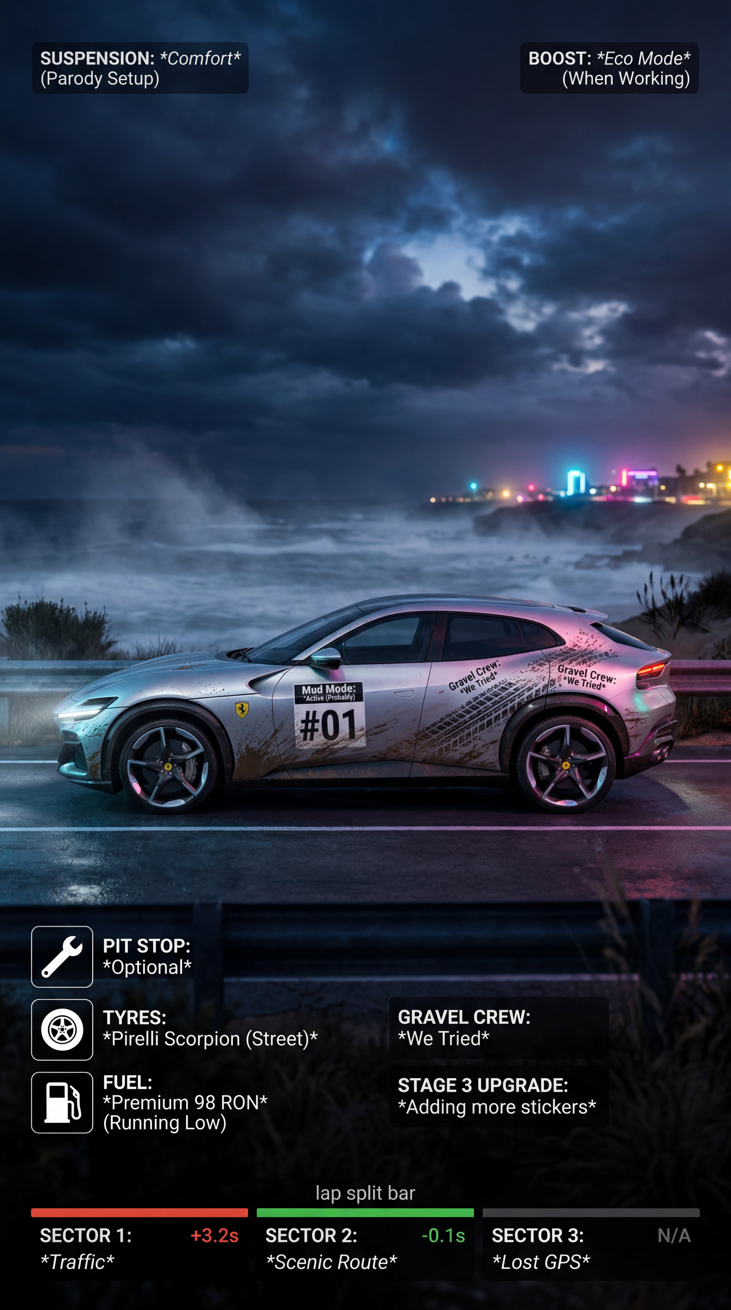 Exterior-only SEO concept render of the Ferrari Purosangue Concept SUV. Search intent target: "ferrari purosangue concept upgrades". Direction: funny parody wrap concept built for viral social sharing and meme intent. Wrap/livery concept: rally mud-splatter narrative wrap with fake stage numbers and service-crew decals. Overlay plan: motorsport telemetry overlays: faux pit board icons, lap split bars, and setup labels. Scene: on a coastal highway with windblown mist and dramatic cloud breakup. Camera: tight side profile with long lens compression. Lighting: nighttime neon contrast with controlled bloom. Render style: photorealistic automotive marketing render with premium detail and realistic materials. Creative hook: thumbnail-first composition with immediate visual hierarchy. Keep it relevant to the search query and avoid duplicating prior visual directions for similar models. If web grounding is available, incorporate up-to-date public facts that support the keyword context and keep claims realistic. Use fictional/parody overlay labels only (no exact trademark logos). No interior views, no cabin, no cockpit, no dashboard, no seats, no people, no explicit smoking act, no watermarks.