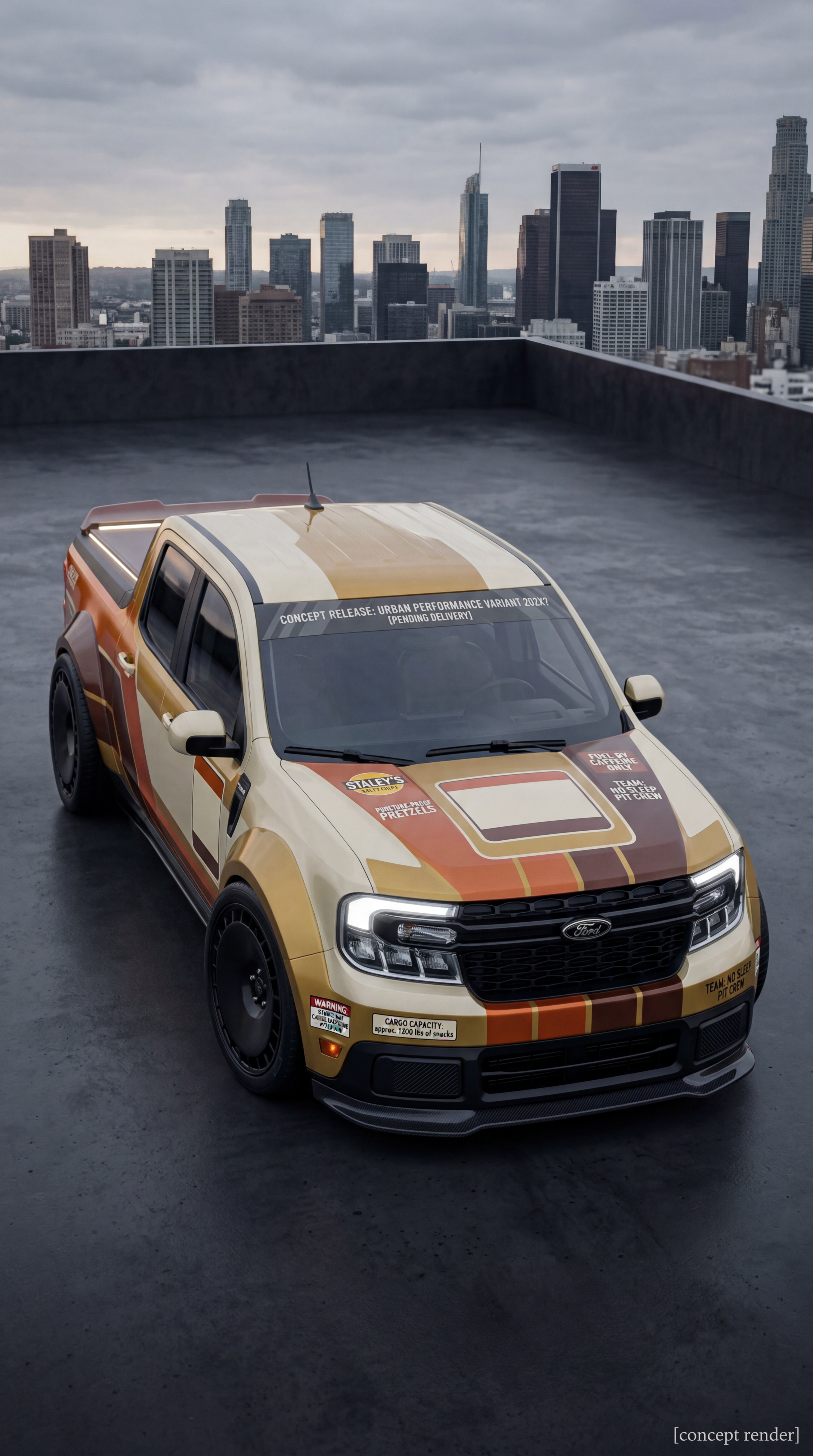 Exterior-only SEO concept render of the Ford Maverick Concept pickup truck. Search intent target: "ford maverick concept release date". Direction: premium luxury hero concept with restrained high-end detailing. Wrap/livery concept: retro tobacco-era color blocking with fictional cigarette-style sponsor rectangles and no real logos. Overlay plan: humor-first overlays: made-up snack brands, joke pit crew logos, and playful warning stickers. Scene: at a city rooftop event space with cinematic skyline backplate. Camera: head-on symmetry with aggressive stance emphasis. Lighting: overcast softbox light that reveals body surfacing. Render style: photorealistic automotive marketing render with premium detail and realistic materials. Creative hook: editorial magazine cover feel with clean negative space. Keep it relevant to the search query and avoid duplicating prior visual directions for similar models. If web grounding is available, incorporate up-to-date public facts that support the keyword context and keep claims realistic. Use fictional/parody overlay labels only (no exact trademark logos). No interior views, no cabin, no cockpit, no dashboard, no seats, no people, no explicit smoking act, no watermarks.