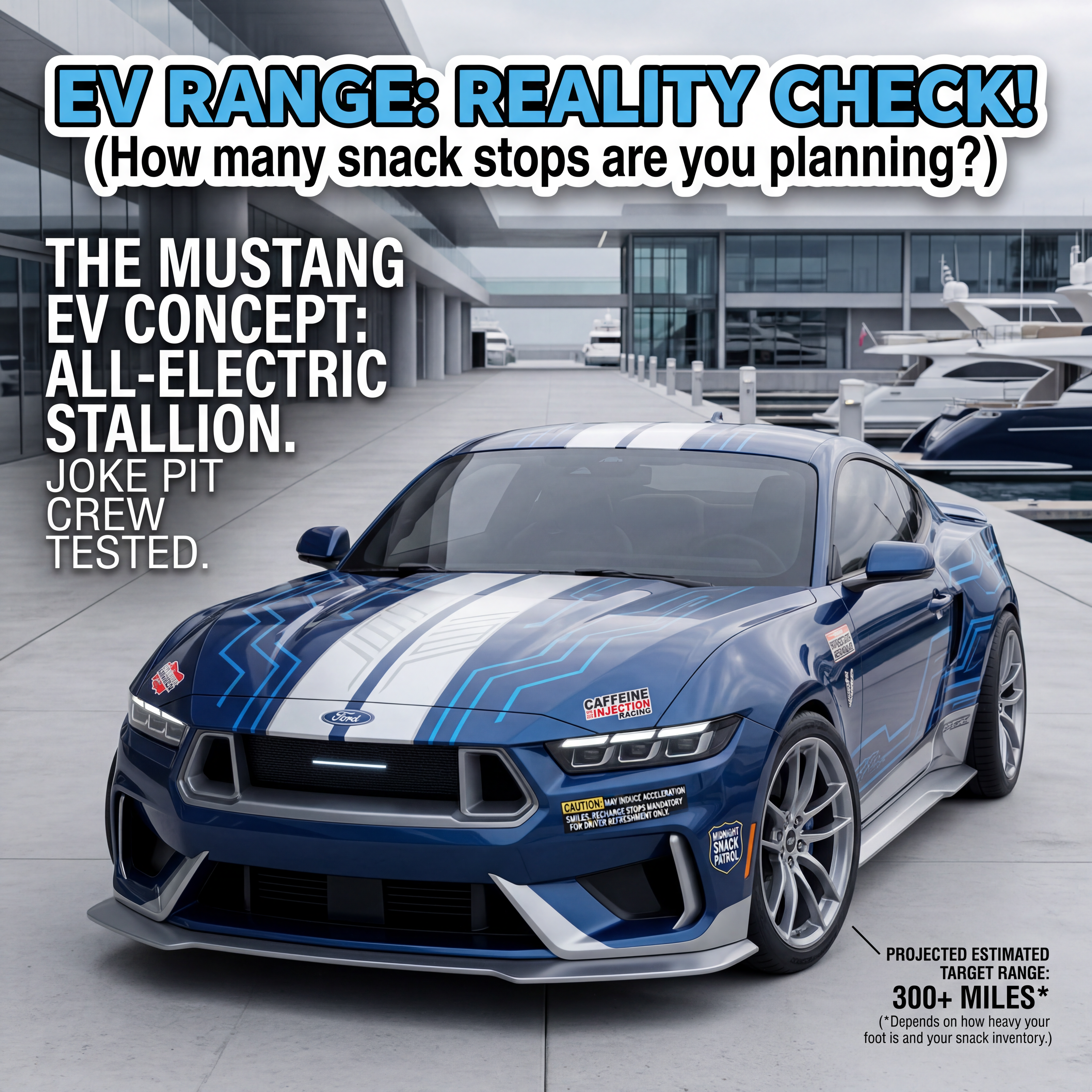 Exterior-only SEO concept render of the Ford Mustang EV Concept sports car. Search intent target: "ford mustang ev concept range". Direction: showroom launch visual with high CTR composition for image search. Wrap/livery concept: heritage endurance stripes with contemporary geometry and polished aero callouts. Overlay plan: humor-first overlays: made-up snack brands, joke pit crew logos, and playful warning stickers. Scene: outside a luxury marina with polished concrete and glass facades. Camera: head-on symmetry with aggressive stance emphasis. Lighting: overcast softbox light that reveals body surfacing. Render style: photoreal EV concept rendering with technical surface detail and precise lighting. Creative hook: editorial magazine cover feel with clean negative space. Keep it relevant to the search query and avoid duplicating prior visual directions for similar models. If web grounding is available, incorporate up-to-date public facts that support the keyword context and keep claims realistic. Use fictional/parody overlay labels only (no exact trademark logos). No interior views, no cabin, no cockpit, no dashboard, no seats, no people, no explicit smoking act, no watermarks.