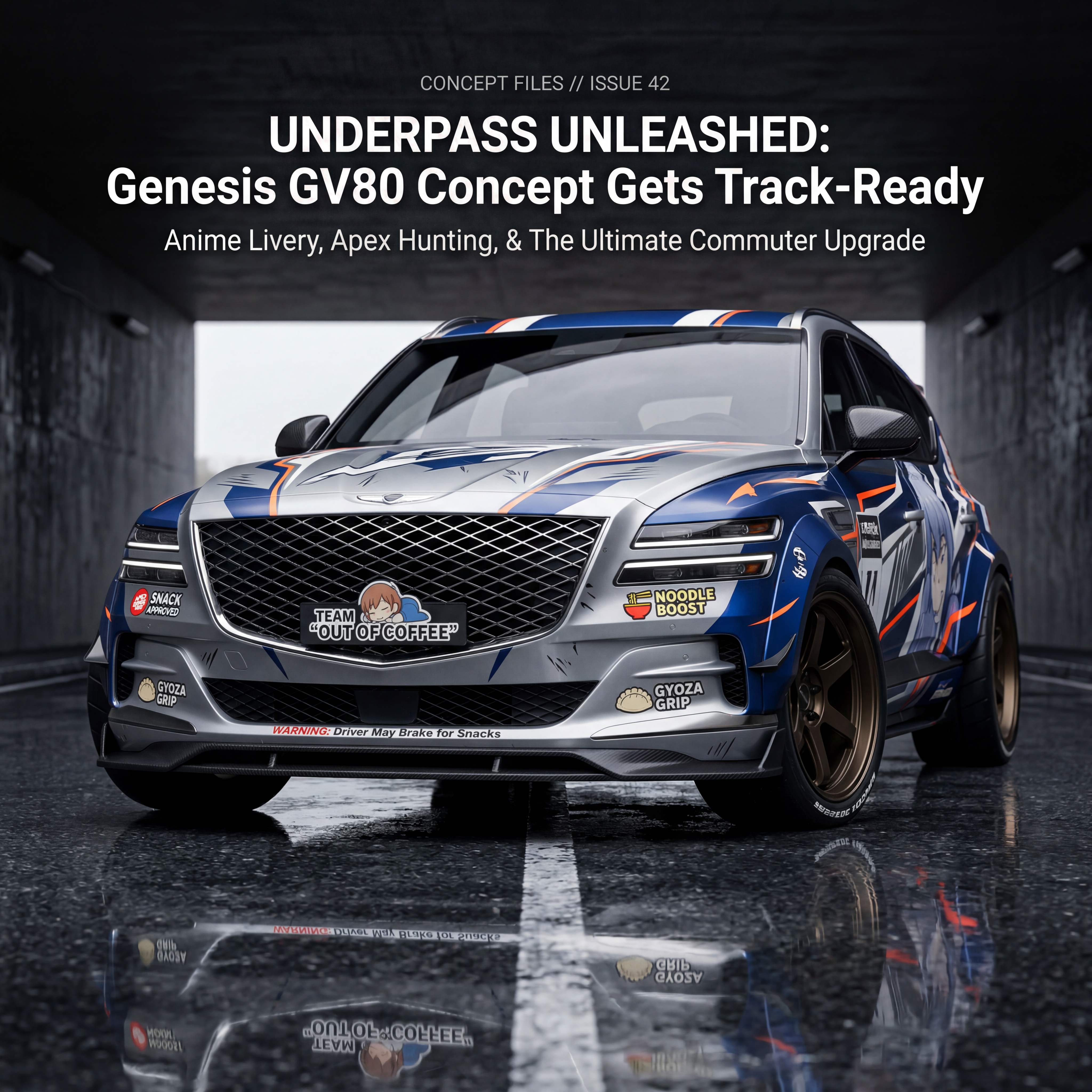 Exterior-only SEO concept render of the Genesis GV80 Concept SUV. Search intent target: "genesis gv80 concept interior upgrades". Direction: track-day special theme for an ordinary commuter car with pro-livery discipline. Wrap/livery concept: anime race-team style with cel-shaded accent graphics and manga motion glyphs. Overlay plan: humor-first overlays: made-up snack brands, joke pit crew logos, and playful warning stickers. Scene: on a wet downtown underpass with reflection-heavy asphalt. Camera: head-on symmetry with aggressive stance emphasis. Lighting: overcast softbox light that reveals body surfacing. Render style: photorealistic automotive marketing render with premium detail and realistic materials. Creative hook: editorial magazine cover feel with clean negative space. Keep it relevant to the search query and avoid duplicating prior visual directions for similar models. If web grounding is available, incorporate up-to-date public facts that support the keyword context and keep claims realistic. Use fictional/parody overlay labels only (no exact trademark logos). No interior views, no cabin, no cockpit, no dashboard, no seats, no people, no explicit smoking act, no watermarks.