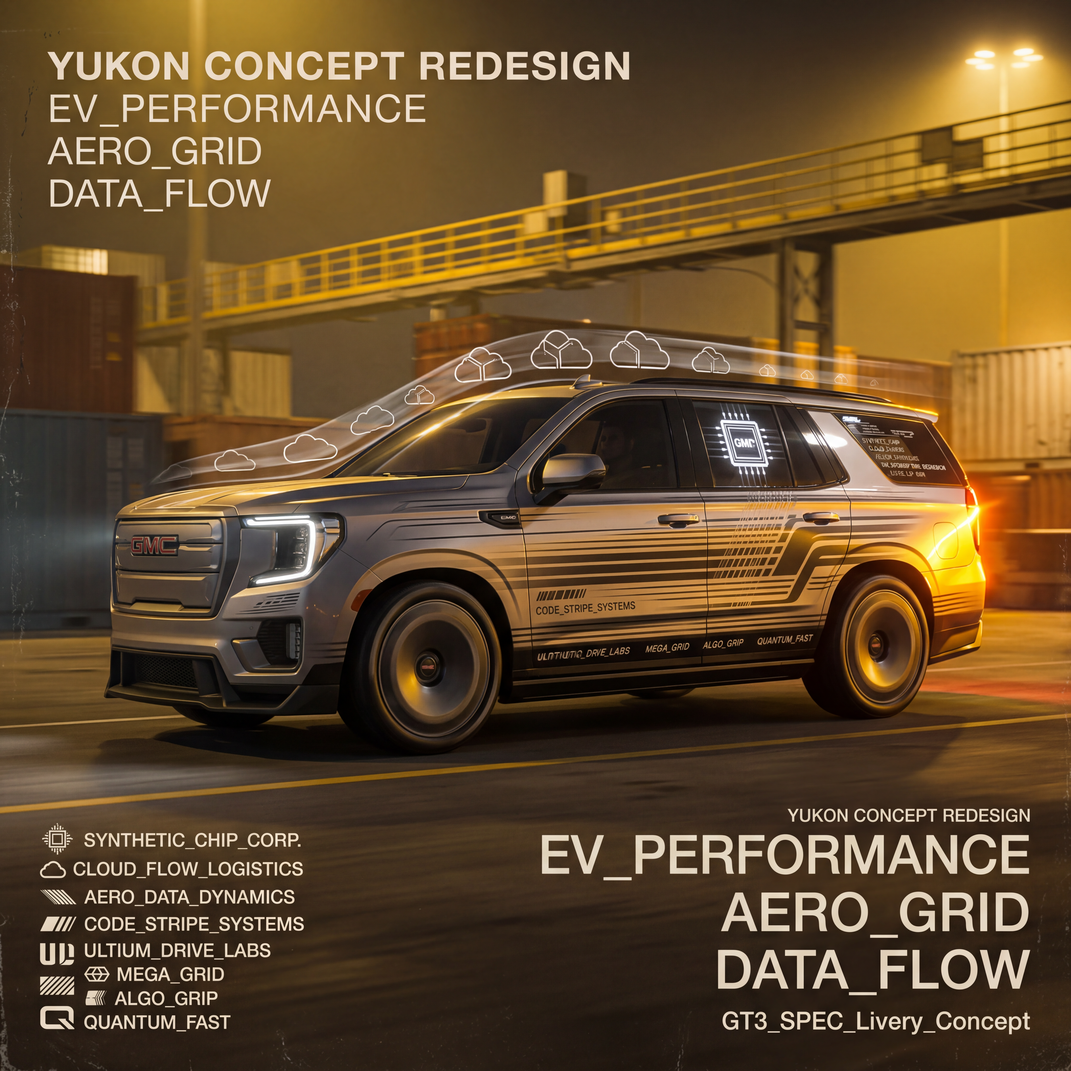 Exterior-only SEO concept render of the GMC Yukon Concept SUV. Search intent target: "gmc yukon concept redesign". Direction: EV performance identity with technical aero graphics and clean panel geometry. Wrap/livery concept: GT3-inspired livery with layered speed lines, fake team marks, and tire sponsor blocks. Overlay plan: tech-company parody overlays: synthetic chip logos, cloud symbols, and code-like stripe systems. Scene: inside an industrial loading yard with sodium-vapor night lighting. Camera: wheel-height panning shot with subtle motion blur. Lighting: hard-edged sunset rim light with reflective paint pop. Render style: photorealistic automotive marketing render with premium detail and realistic materials. Creative hook: race poster energy with layered visual storytelling. Keep it relevant to the search query and avoid duplicating prior visual directions for similar models. If web grounding is available, incorporate up-to-date public facts that support the keyword context and keep claims realistic. Use fictional/parody overlay labels only (no exact trademark logos). No interior views, no cabin, no cockpit, no dashboard, no seats, no people, no explicit smoking act, no watermarks.