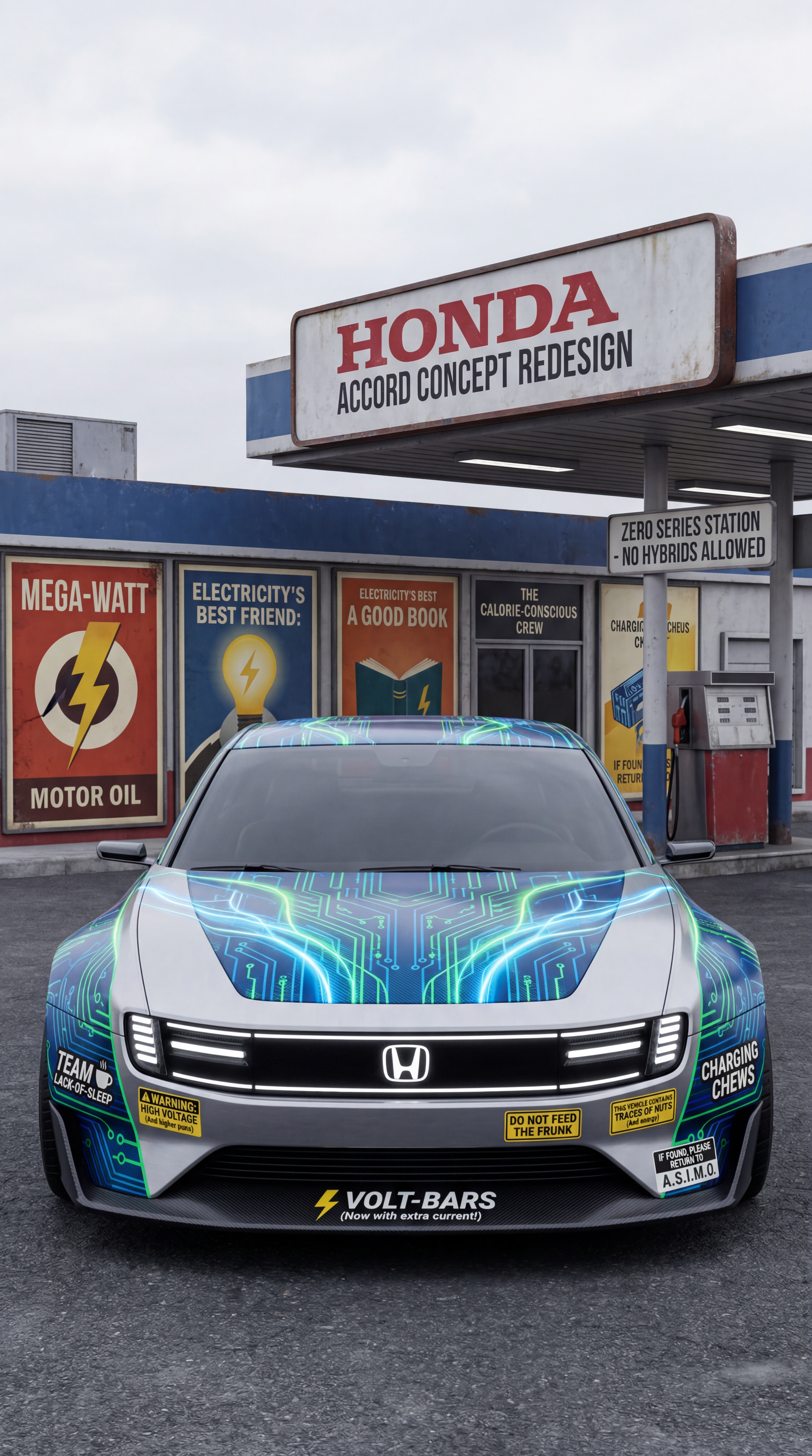 Exterior-only SEO concept render of the Honda Accord Concept vehicle. Search intent target: "honda accord concept redesign". Direction: retro motorsport revival with modern materials and period-correct composition. Wrap/livery concept: EV circuit-board graphics with battery-cell iconography and synthetic energy arcs. Overlay plan: humor-first overlays: made-up snack brands, joke pit crew logos, and playful warning stickers. Scene: at a small-town fuel station styled as a retro poster set. Camera: head-on symmetry with aggressive stance emphasis. Lighting: overcast softbox light that reveals body surfacing. Render style: photorealistic automotive marketing render with premium detail and realistic materials. Creative hook: editorial magazine cover feel with clean negative space. Keep it relevant to the search query and avoid duplicating prior visual directions for similar models. If web grounding is available, incorporate up-to-date public facts that support the keyword context and keep claims realistic. Use fictional/parody overlay labels only (no exact trademark logos). No interior views, no cabin, no cockpit, no dashboard, no seats, no people, no explicit smoking act, no watermarks.
