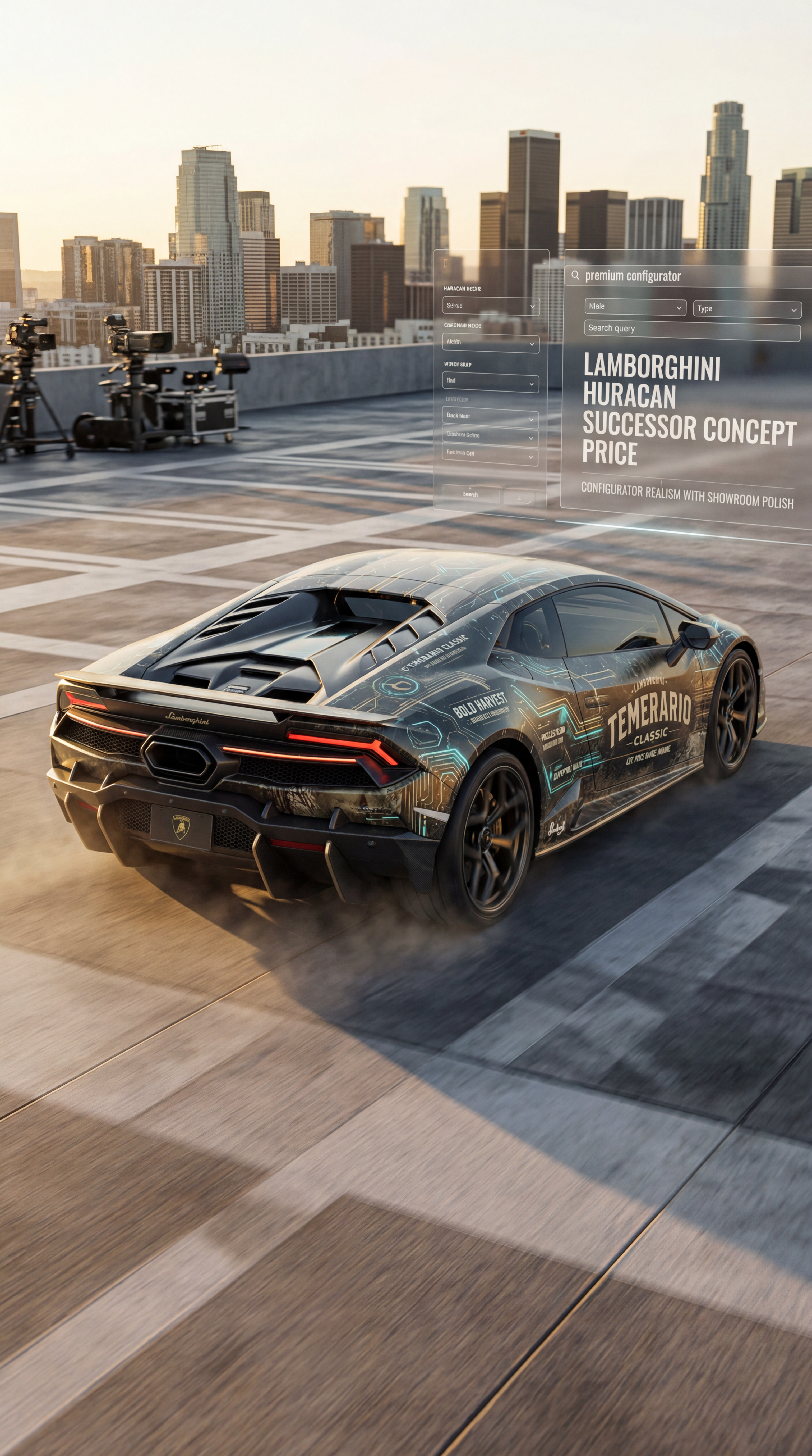 Exterior-only SEO concept render of the Lamborghini Huracan Successor Concept supercar. Search intent target: "lamborghini huracan successor concept price". Direction: premium luxury hero concept with restrained high-end detailing. Wrap/livery concept: EV circuit-board graphics with battery-cell iconography and synthetic energy arcs. Overlay plan: fictional tobacco-inspired retro decals (no real trademarks) with distressed print texture. Scene: at a city rooftop event space with cinematic skyline backplate. Camera: high rear three-quarter rolling follow shot. Lighting: golden-hour directional light with long highlights. Render style: photorealistic automotive marketing render with premium detail and realistic materials. Creative hook: premium configurator realism with showroom polish. Keep it relevant to the search query and avoid duplicating prior visual directions for similar models. If web grounding is available, incorporate up-to-date public facts that support the keyword context and keep claims realistic. Use fictional/parody overlay labels only (no exact trademark logos). No interior views, no cabin, no cockpit, no dashboard, no seats, no people, no explicit smoking act, no watermarks.