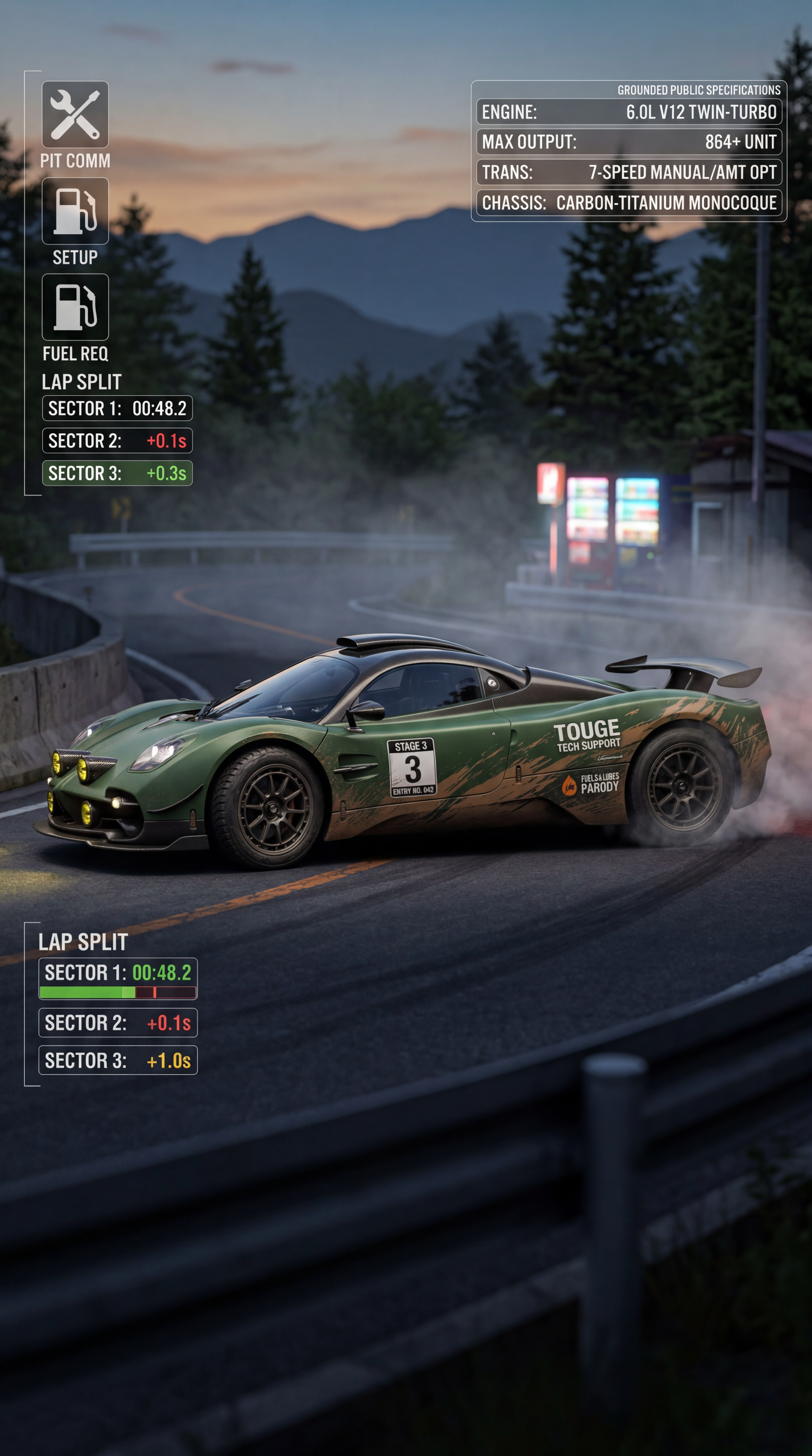 Exterior-only SEO concept render of the Pagani Utopia Concept hypercar. Search intent target: "pagani utopia concept specs". Direction: daily-driver race conversion with practical body kit and street-legal realism. Wrap/livery concept: rally mud-splatter narrative wrap with fake stage numbers and service-crew decals. Overlay plan: motorsport telemetry overlays: faux pit board icons, lap split bars, and setup labels. Scene: on a mountain touge road with tire smoke and late-evening haze. Camera: tight side profile with long lens compression. Lighting: nighttime neon contrast with controlled bloom. Render style: photorealistic automotive marketing render with premium detail and realistic materials. Creative hook: thumbnail-first composition with immediate visual hierarchy. Keep it relevant to the search query and avoid duplicating prior visual directions for similar models. If web grounding is available, incorporate up-to-date public facts that support the keyword context and keep claims realistic. Use fictional/parody overlay labels only (no exact trademark logos). No interior views, no cabin, no cockpit, no dashboard, no seats, no people, no explicit smoking act, no watermarks.