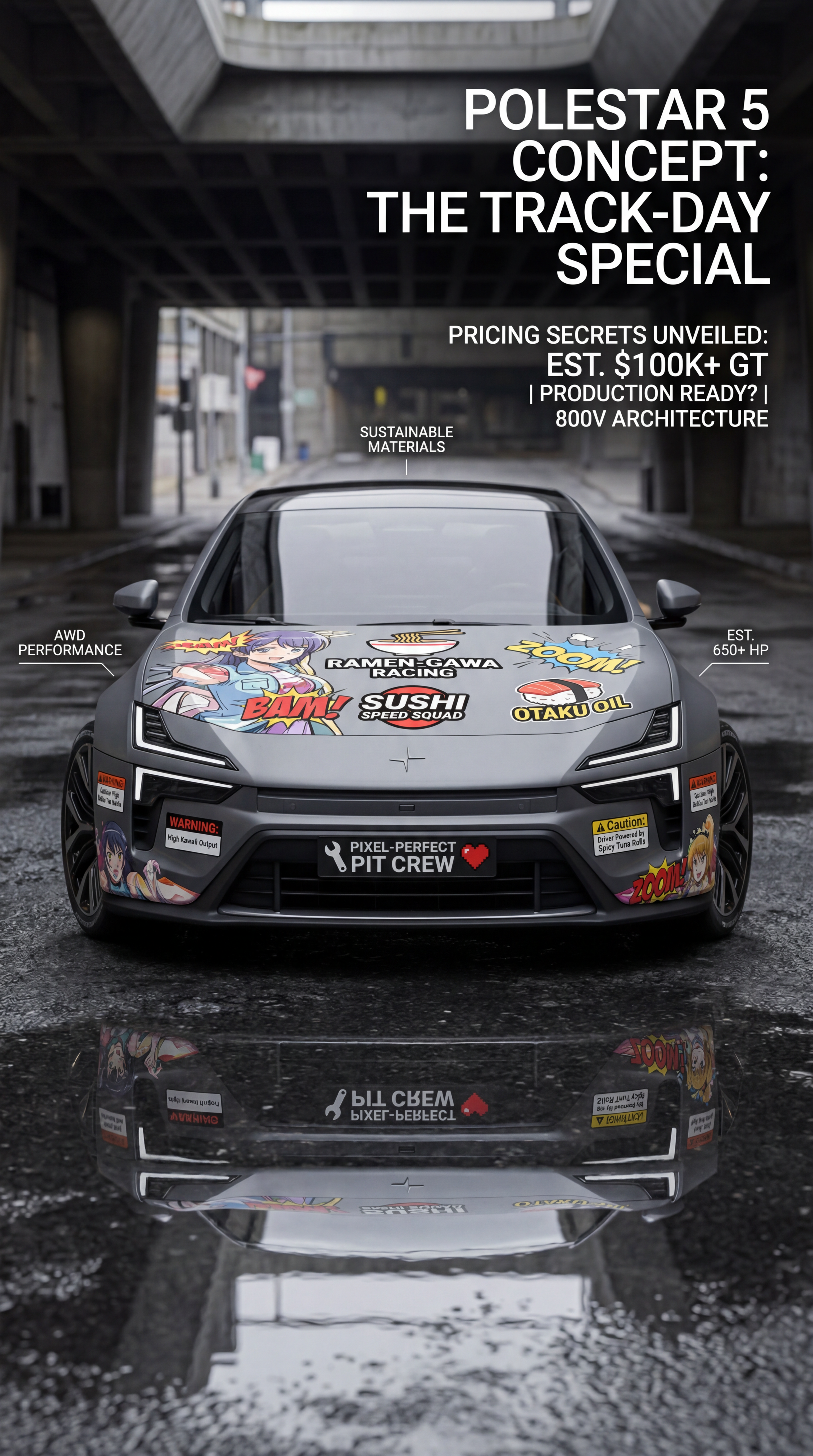 Exterior-only SEO concept render of the Polestar 5 Concept electric vehicle. Search intent target: "polestar 5 concept price". Direction: track-day special theme for an ordinary commuter car with pro-livery discipline. Wrap/livery concept: anime race-team style with cel-shaded accent graphics and manga motion glyphs. Overlay plan: humor-first overlays: made-up snack brands, joke pit crew logos, and playful warning stickers. Scene: on a wet downtown underpass with reflection-heavy asphalt. Camera: head-on symmetry with aggressive stance emphasis. Lighting: overcast softbox light that reveals body surfacing. Render style: photoreal EV concept rendering with technical surface detail and precise lighting. Creative hook: editorial magazine cover feel with clean negative space. Keep it relevant to the search query and avoid duplicating prior visual directions for similar models. If web grounding is available, incorporate up-to-date public facts that support the keyword context and keep claims realistic. Use fictional/parody overlay labels only (no exact trademark logos). No interior views, no cabin, no cockpit, no dashboard, no seats, no people, no explicit smoking act, no watermarks.