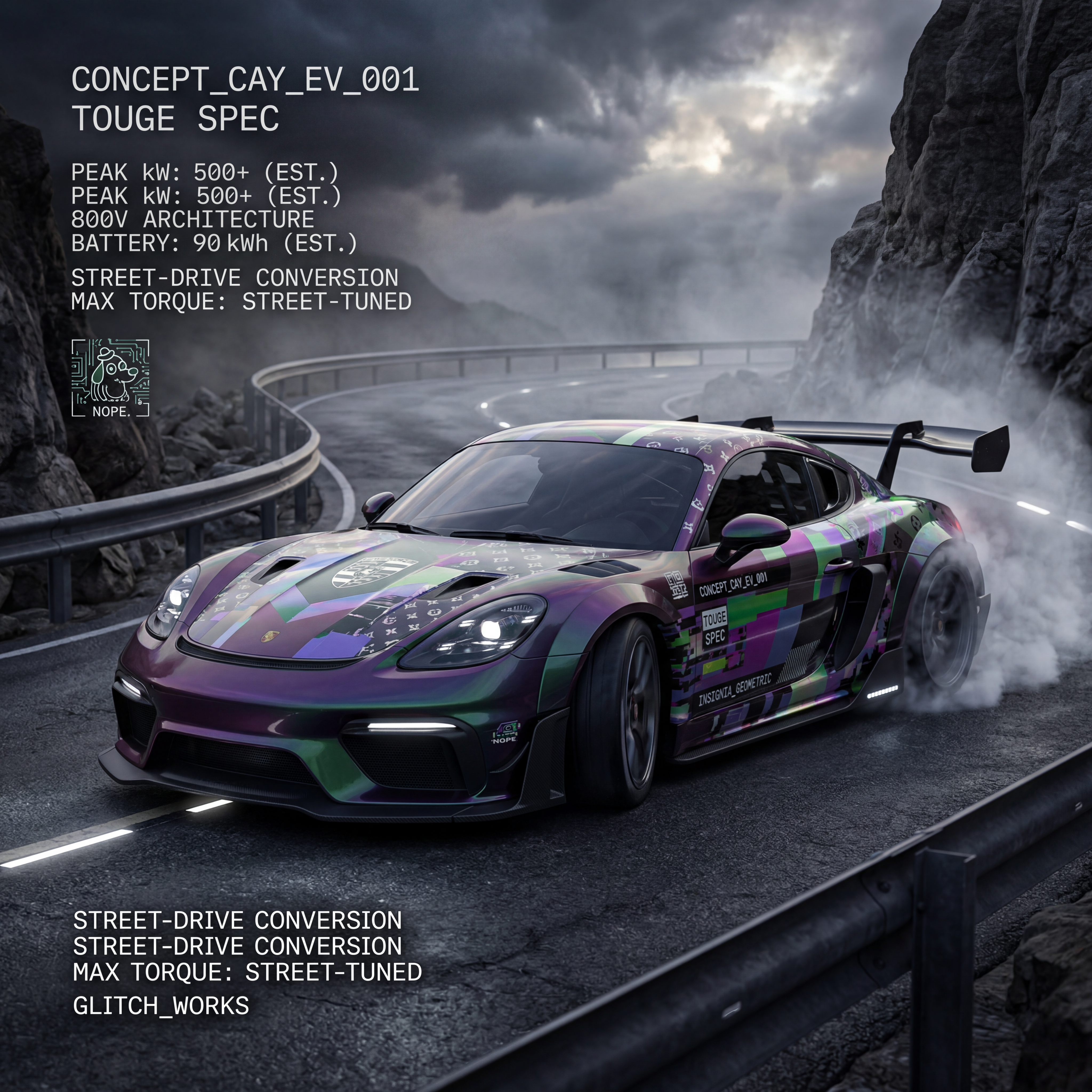 Exterior-only SEO concept render of the Porsche Cayman EV Concept sports car. Search intent target: "porsche cayman ev concept specs". Direction: daily-driver race conversion with practical body kit and street-legal realism. Wrap/livery concept: street drift style with glitch patterns, iridescent vinyl, and stylized faux-brand marks. Overlay plan: parody luxury-brand monogram overlays with abstract crests and geometric insignias. Scene: on a mountain touge road with tire smoke and late-evening haze. Camera: low front three-quarter hero angle. Lighting: storm-break dramatic sky with selective specular accents. Render style: photoreal EV concept rendering with technical surface detail and precise lighting. Creative hook: meme-ready surprise detail hidden in decals for replay value. Keep it relevant to the search query and avoid duplicating prior visual directions for similar models. If web grounding is available, incorporate up-to-date public facts that support the keyword context and keep claims realistic. Use fictional/parody overlay labels only (no exact trademark logos). No interior views, no cabin, no cockpit, no dashboard, no seats, no people, no explicit smoking act, no watermarks.