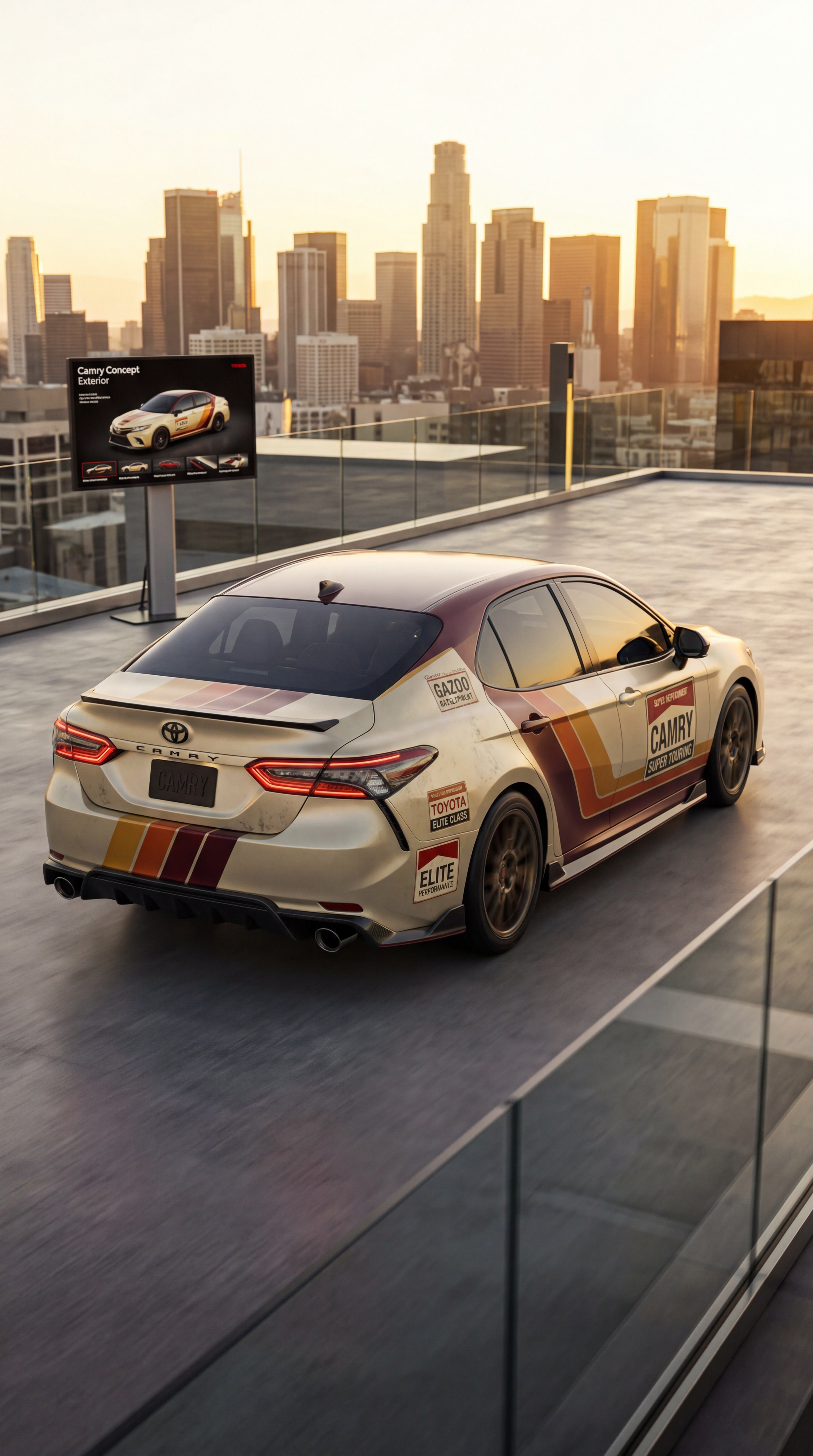 Exterior-only SEO concept render of the Toyota Camry Concept vehicle. Search intent target: "toyota camry concept interior". Direction: premium luxury hero concept with restrained high-end detailing. Wrap/livery concept: retro tobacco-era color blocking with fictional cigarette-style sponsor rectangles and no real logos. Overlay plan: fictional tobacco-inspired retro decals (no real trademarks) with distressed print texture. Scene: at a city rooftop event space with cinematic skyline backplate. Camera: high rear three-quarter rolling follow shot. Lighting: golden-hour directional light with long highlights. Render style: photorealistic automotive marketing render with premium detail and realistic materials. Creative hook: premium configurator realism with showroom polish. Keep it relevant to the search query and avoid duplicating prior visual directions for similar models. If web grounding is available, incorporate up-to-date public facts that support the keyword context and keep claims realistic. Use fictional/parody overlay labels only (no exact trademark logos). No interior views, no cabin, no cockpit, no dashboard, no seats, no people, no explicit smoking act, no watermarks.