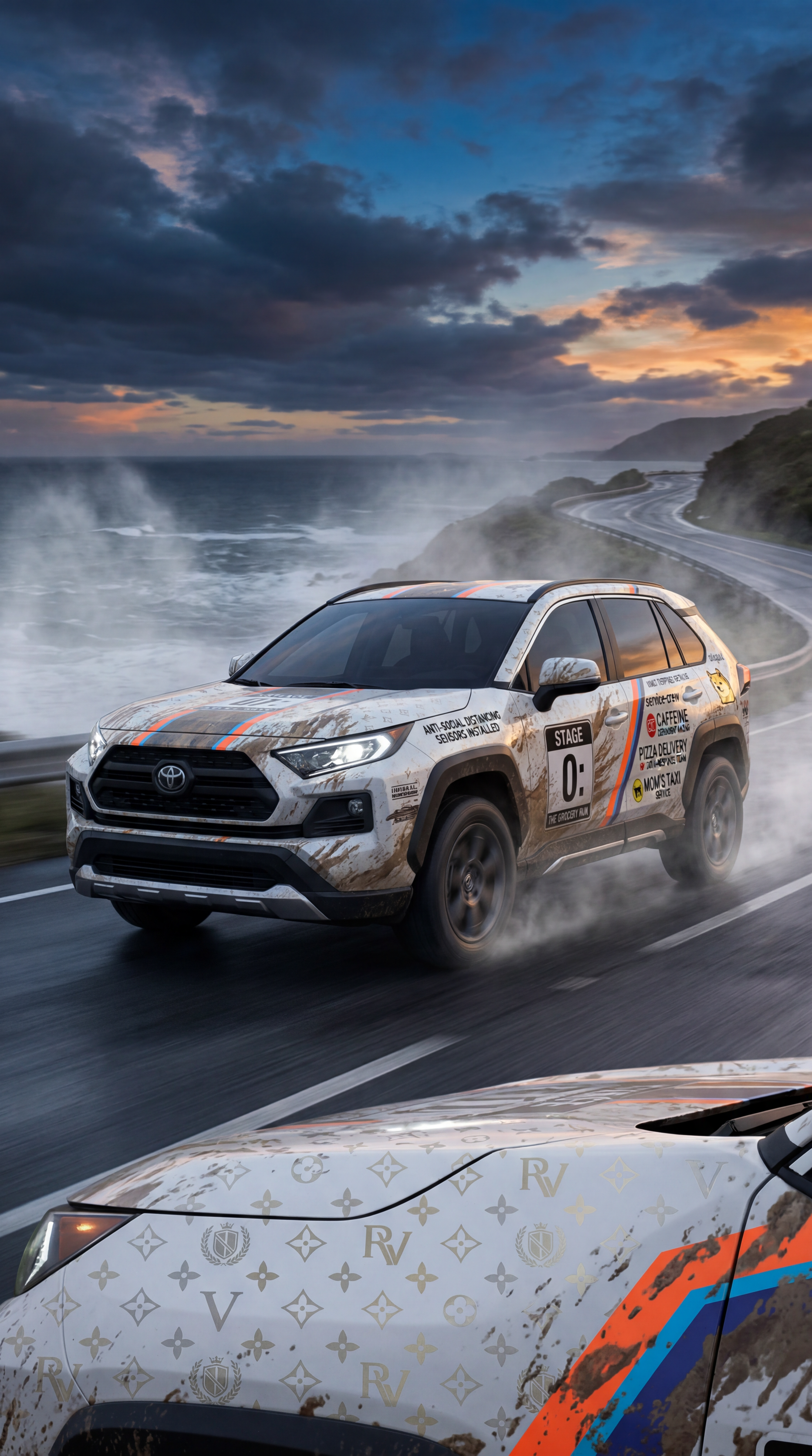Exterior-only SEO concept render of the Toyota RAV4 Concept SUV. Search intent target: "toyota rav4 concept redesign". Direction: funny parody wrap concept built for viral social sharing and meme intent. Wrap/livery concept: rally mud-splatter narrative wrap with fake stage numbers and service-crew decals. Overlay plan: parody luxury-brand monogram overlays with abstract crests and geometric insignias. Scene: on a coastal highway with windblown mist and dramatic cloud breakup. Camera: low front three-quarter hero angle. Lighting: storm-break dramatic sky with selective specular accents. Render style: photorealistic automotive marketing render with premium detail and realistic materials. Creative hook: meme-ready surprise detail hidden in decals for replay value. Keep it relevant to the search query and avoid duplicating prior visual directions for similar models. If web grounding is available, incorporate up-to-date public facts that support the keyword context and keep claims realistic. Use fictional/parody overlay labels only (no exact trademark logos). No interior views, no cabin, no cockpit, no dashboard, no seats, no people, no explicit smoking act, no watermarks.