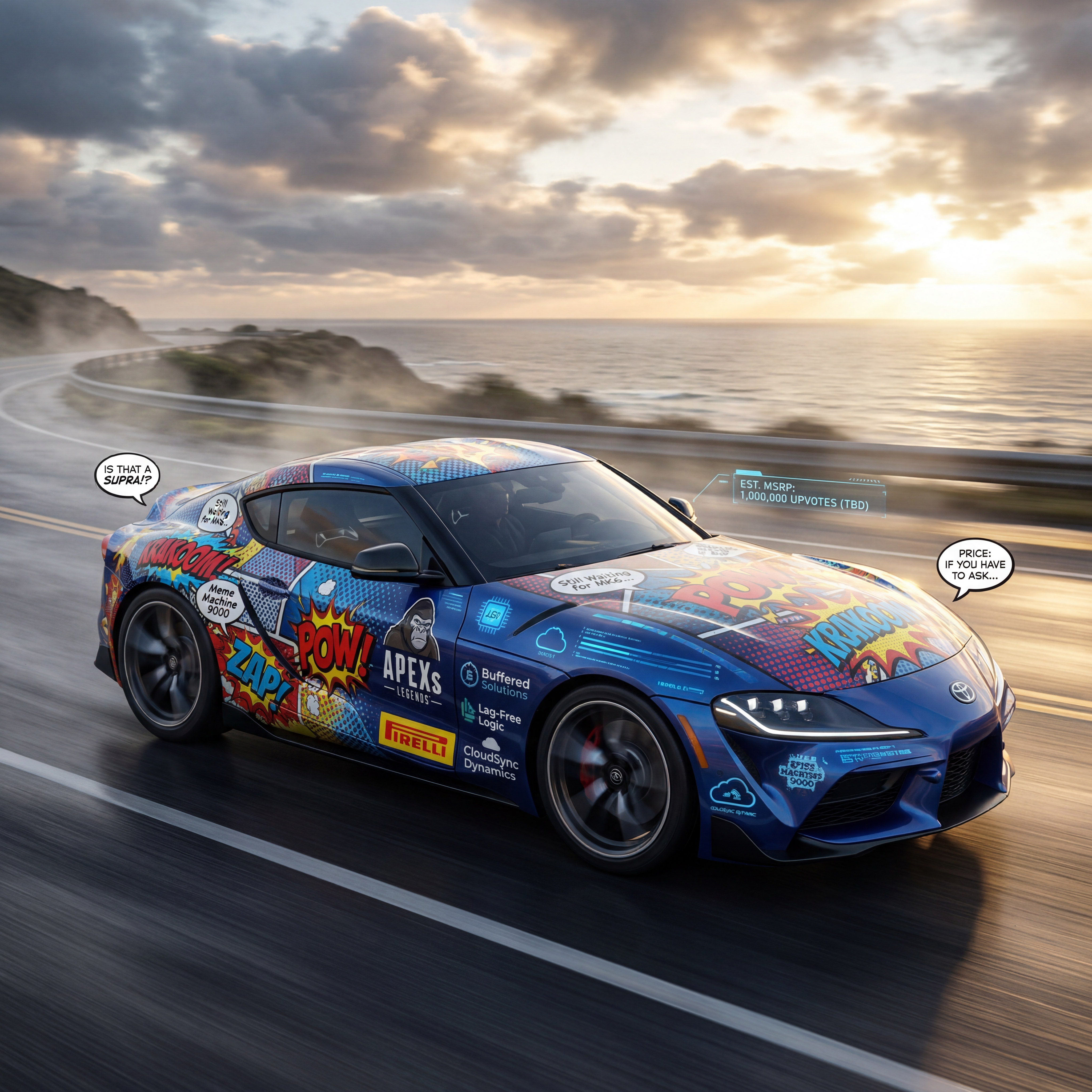 Exterior-only SEO concept render of the Toyota Supra MK6 Concept sports car. Search intent target: "toyota supra mk6 concept price". Direction: funny parody wrap concept built for viral social sharing and meme intent. Wrap/livery concept: comic-book halftone impact panels with parody sponsor badges and speech-bubble icons. Overlay plan: tech-company parody overlays: synthetic chip logos, cloud symbols, and code-like stripe systems. Scene: on a coastal highway with windblown mist and dramatic cloud breakup. Camera: wheel-height panning shot with subtle motion blur. Lighting: hard-edged sunset rim light with reflective paint pop. Render style: photorealistic automotive marketing render with premium detail and realistic materials. Creative hook: race poster energy with layered visual storytelling. Keep it relevant to the search query and avoid duplicating prior visual directions for similar models. If web grounding is available, incorporate up-to-date public facts that support the keyword context and keep claims realistic. Use fictional/parody overlay labels only (no exact trademark logos). No interior views, no cabin, no cockpit, no dashboard, no seats, no people, no explicit smoking act, no watermarks.